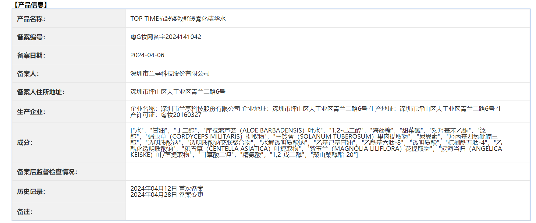 新京报贝壳财经记者查询国产普通化妆品备案信息了解到,该产品的备案编号为“粤G妆网备字2024141042”,备案日期是2024年4月6日,备案人和生产企业均为深圳市兰亭科技股份有限公司。
