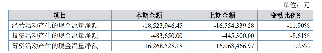 此外,新京报贝壳财经记者注意到,兰亭科技的现金流状况面临不小压力。今年上半年,该公司经营活动产生的现金流量净额为-1852.39万元,同比减少了11.9%;投资活动产生的现金流量净额同比减少8.61%至-48.37万元。截至上半年末,其短期借款达4491.16万元,较上年期末增长59.14%,占总资产的比重也从10.15%增至15.53%,主要原因是“公司为了业务需求,增加银行贷款。”