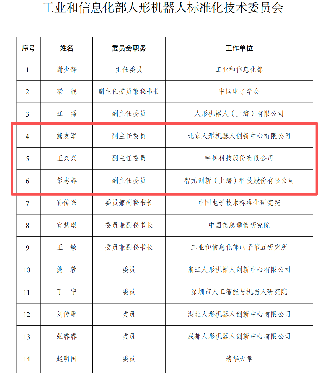 名单显示,北京人形机器人创新中心有限公司CEO熊友军、宇树科技股份有限公司创始人、CEO王兴兴和智元创新(上海)科技股份有限公司联合创始人、总裁、CTO彭志辉担任工业和信息化部人形机器人标准化技术委员会副主任委员。