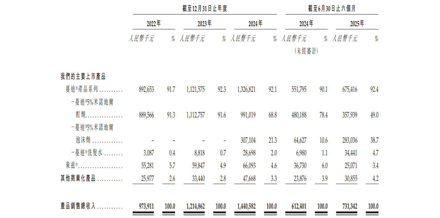 招股书显示,按零售额计算,2024年,其蔓迪系列米诺地尔类产品在国内脱发药物市场及米诺地尔类药物市场分别占有57%和71%的市场份额。