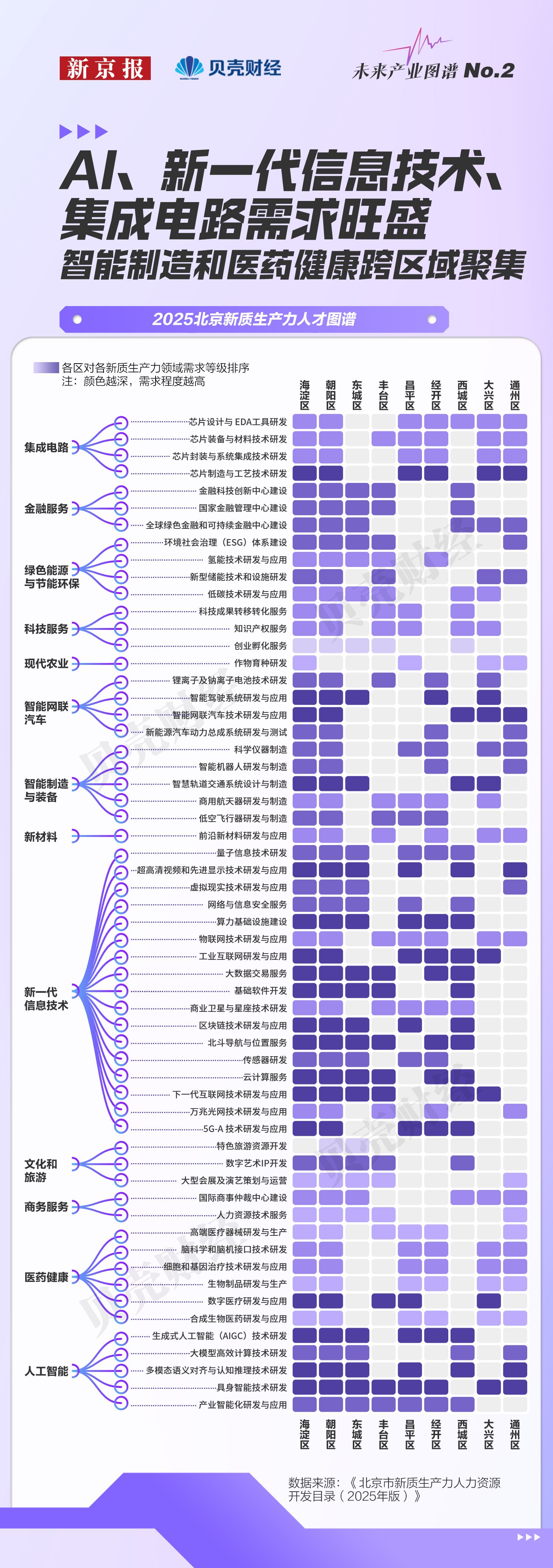 新京报贝壳财经记者梳理《目录》发现,海淀与朝阳在人才重点需求区域中出现频率最高,分别覆盖了58个新质生产力核心领域中的57个,既涉及具身智能、脑机接口、智能驾驶、6G研发等前沿技术,也延伸至知识产权、商事仲裁等配套服务,产业链条完整。