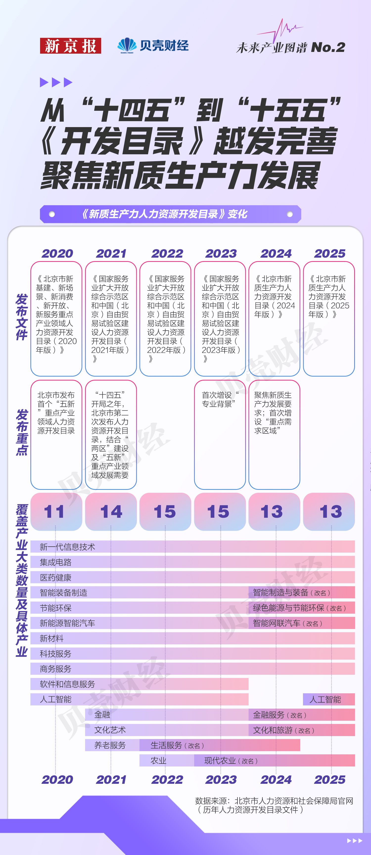 2024年目录升级为《新质生产力人力资源开发目录》,并在2025年继续更新。从设定人才需求评级,到增设重点需求专业及重点需求区域,目录体系逐步完善,已成为北京人才供求市场的重要“晴雨表”。