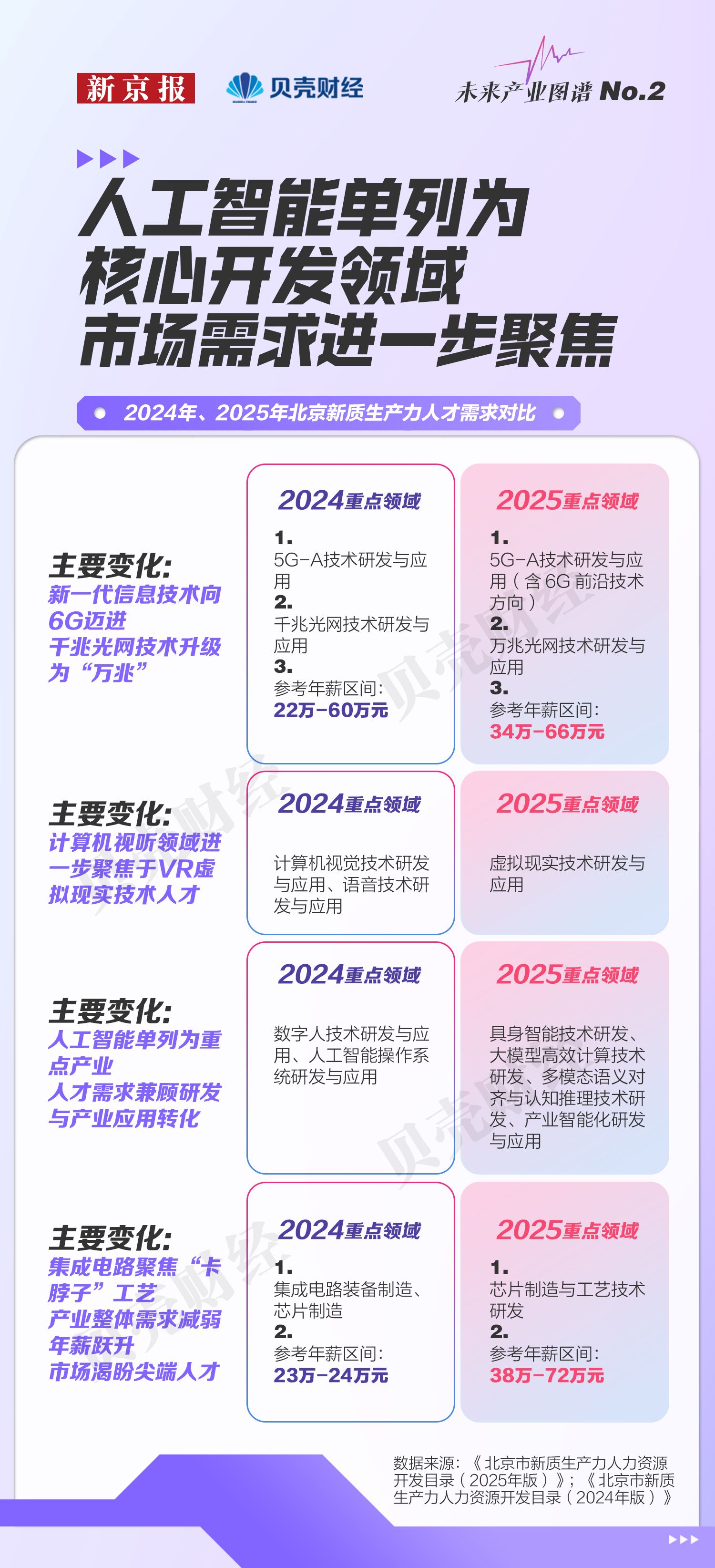 新京报贝壳财经记者发现,与2024年相比,今年《目录》核心开发领域从60个精简至58个,人工智能从新一代信息技术中独立成列;同时,“专家”一词出现频次由28次增至31次,参考年薪区间整体上移。这些变化释放出明确信号——北京的人才需求正进一步向尖端人才聚焦。