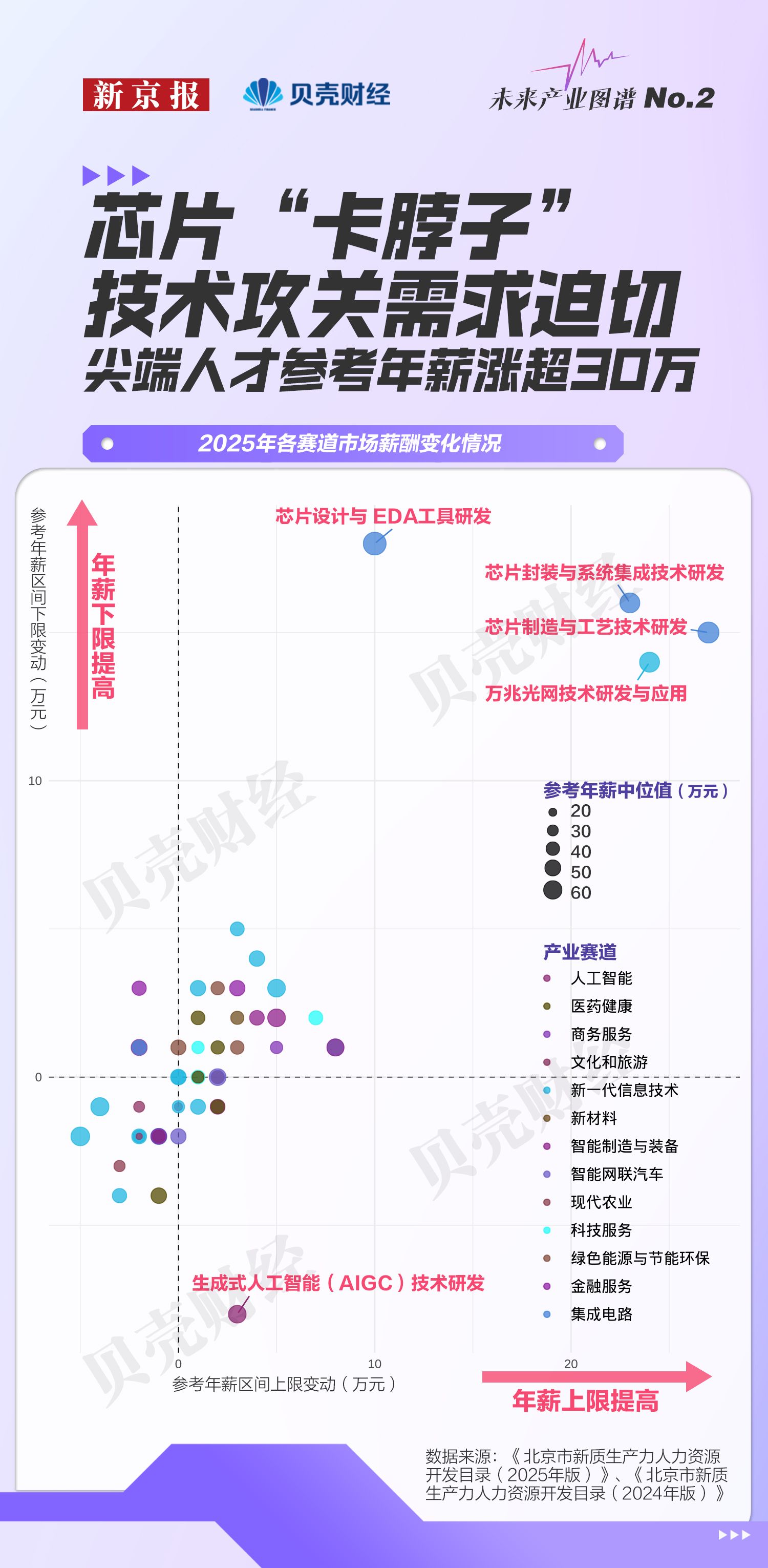 这种趋势并非集成电路产业独有。新京报贝壳财经记者基于《目录》统计发现,在与2024年具有可比数据的52个核心领域中,30个领域的参考年薪上限提高,占比近六成,其中20个领域薪酬区间整体上移。