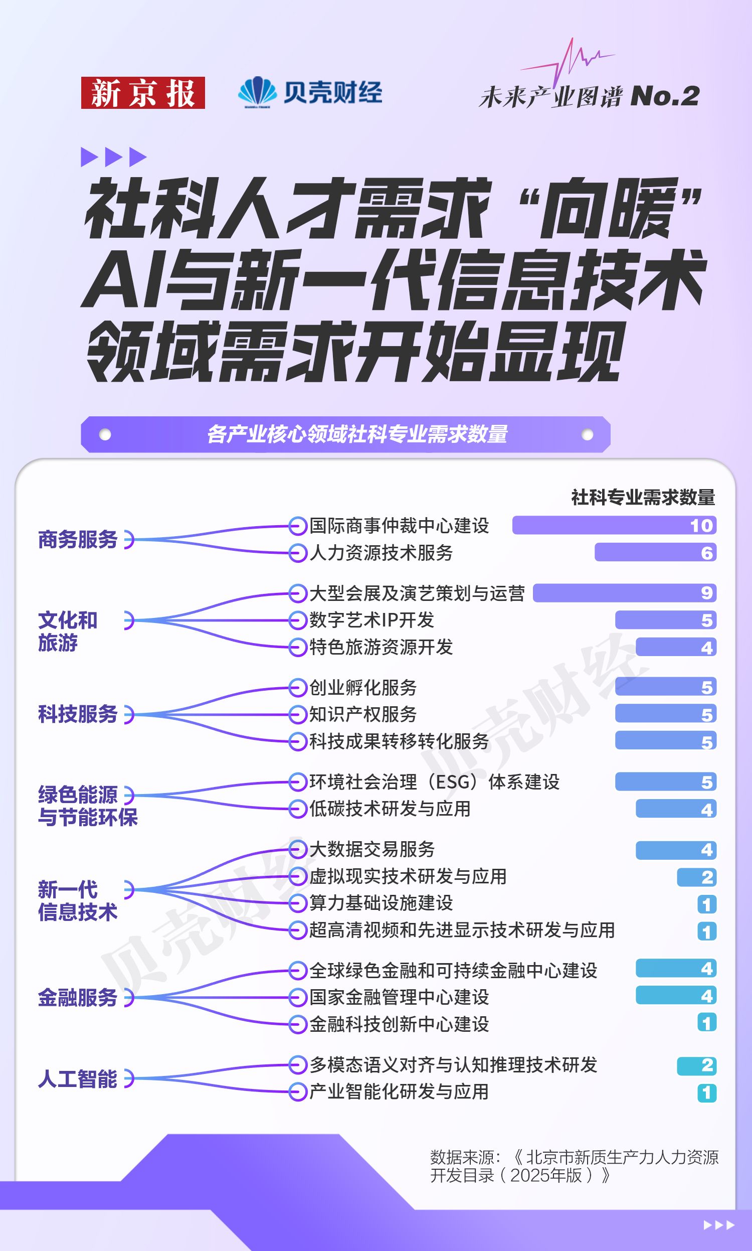 新质生产力带来的复合型人才需求,为社科专业创造了新的市场空间。《目录》显示,社科类人才虽主要集中在商务服务、文化旅游和科技服务等服务业领域,但需求已延伸至人工智能、新一代信息技术等核心科技产业。