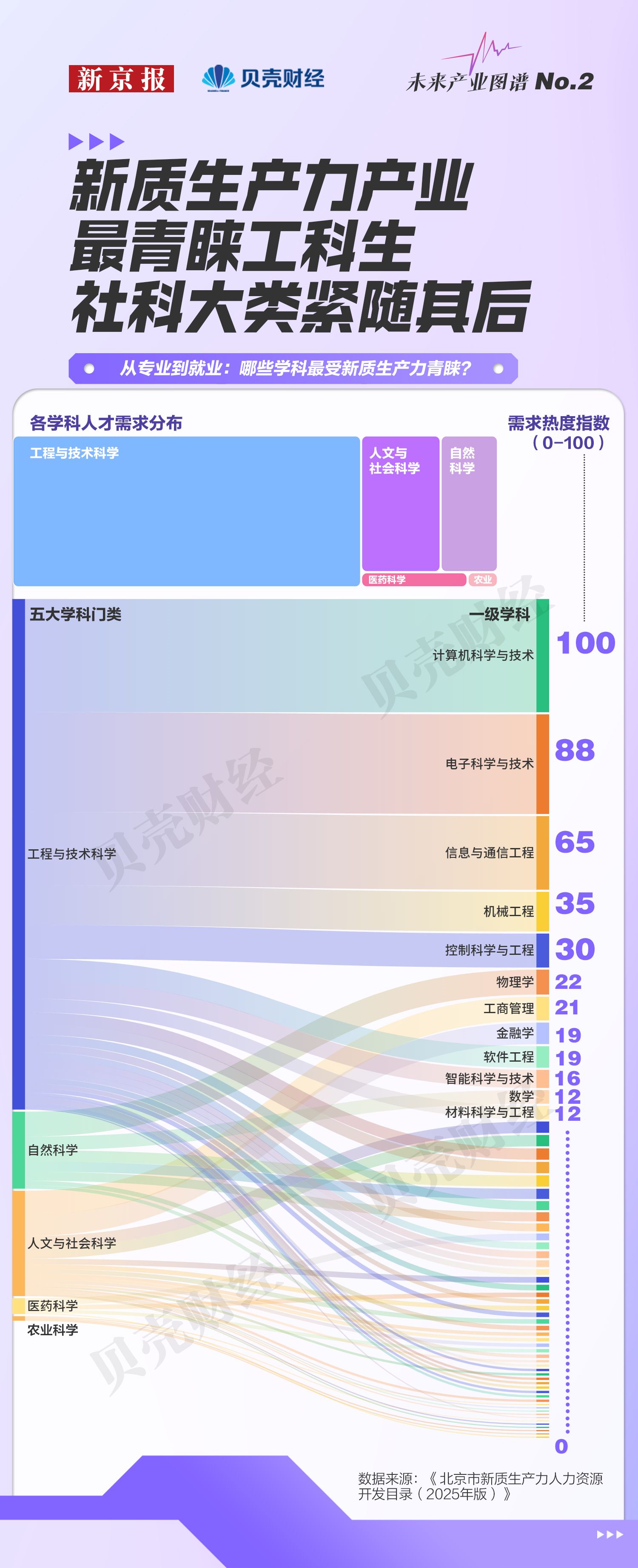 注:各专业按所属一级学科汇总展示;专业需求热度指标(0–100%)由新京报贝壳财经基于《开发目录》测算,将各专业在北京市人才需求目录中的出现次数和人力资源需求评级进行加权求和,归入对应的一级学科计算平均加权分后,进行标准化得出。