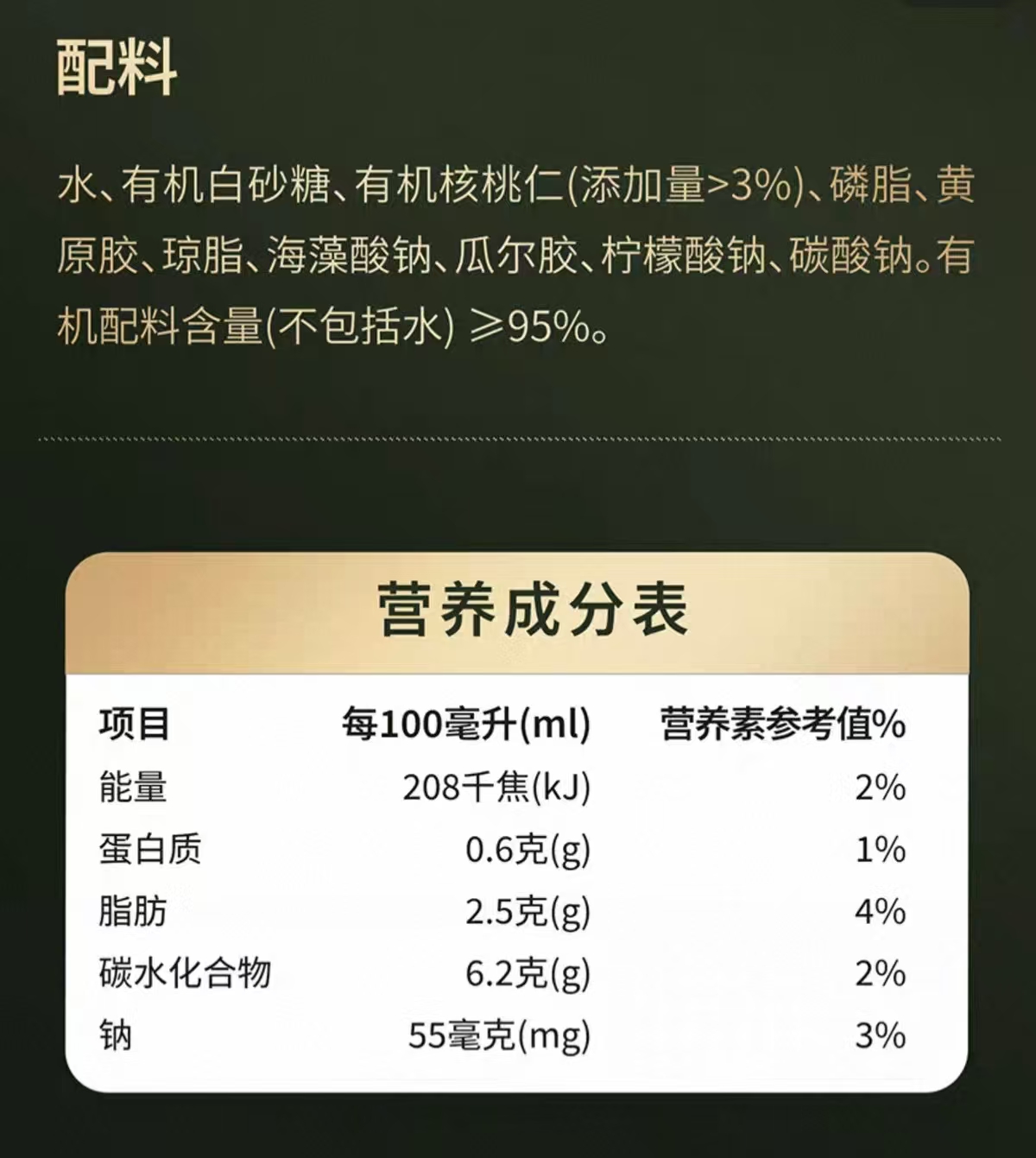 三只松鼠甄养有机核桃乳商品页面宣称与实际蛋白质含量。