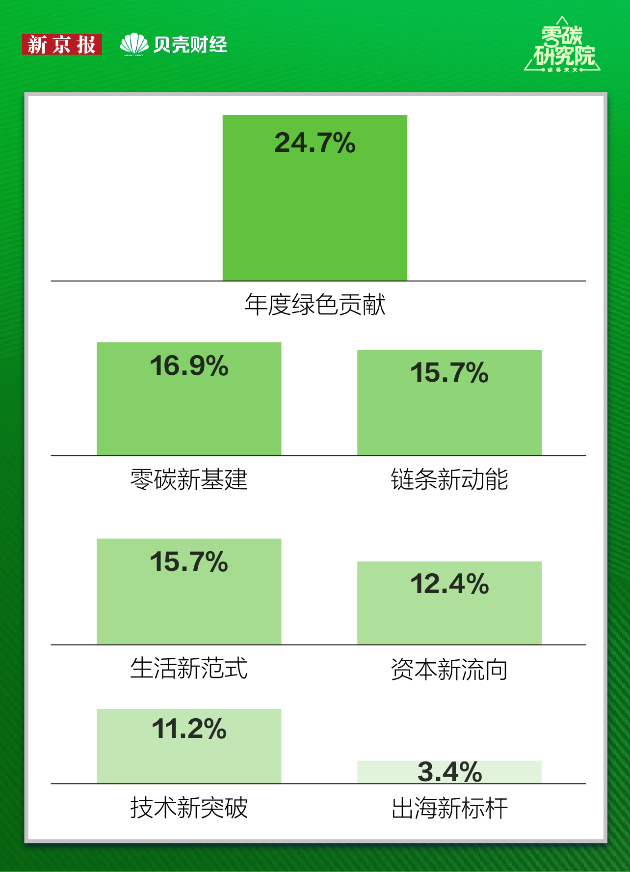 “零碳新基建”和“链条新动能”“生活新范式”分别占比16.9%和15.7%、15.7%,说明从基础设施、产业链到我们的日常生活,绿色变革正在同步发生。