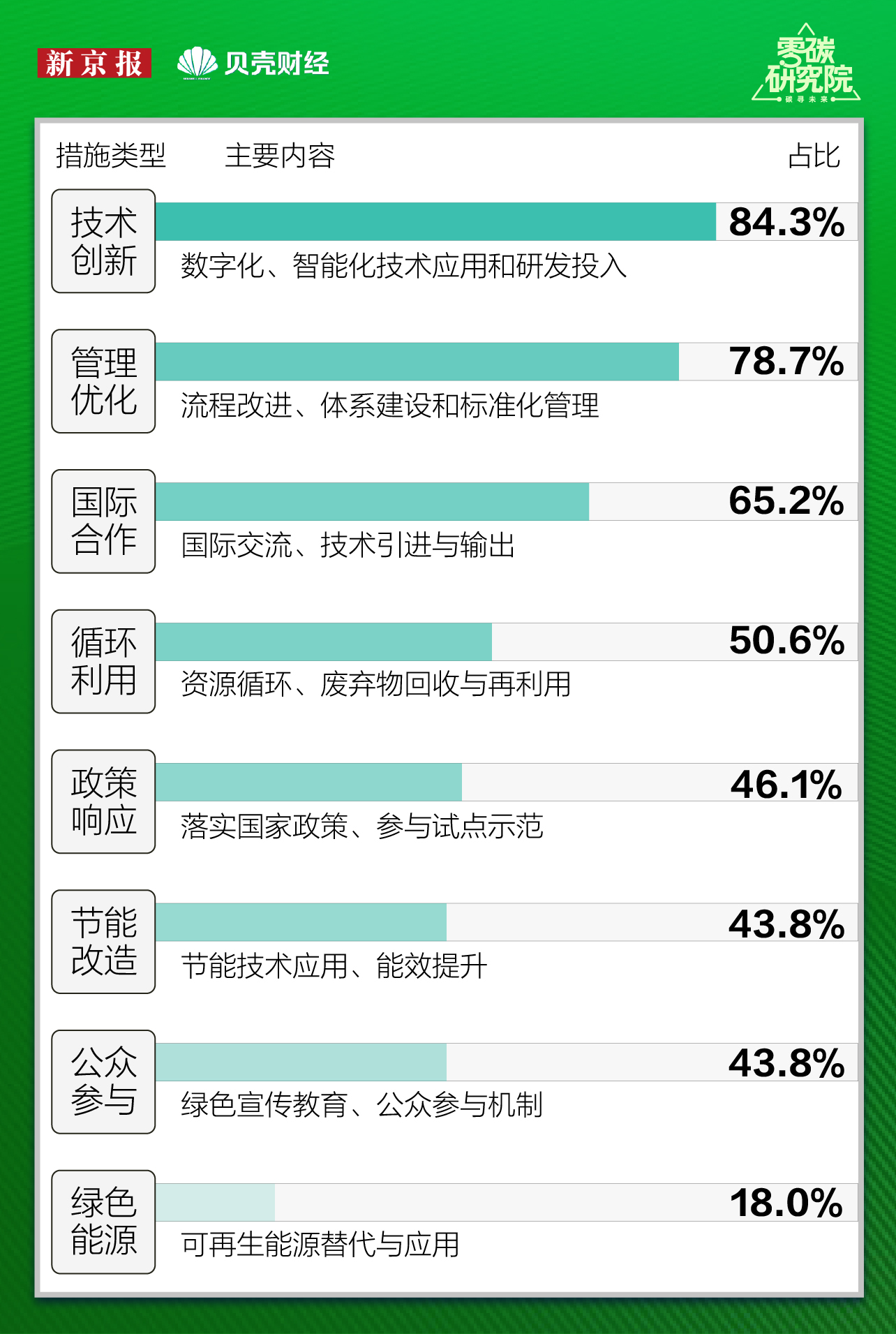 措施上,“技术+管理”是标配,国际合作成热门选项。超84%的案例押注技术创新,超78% 的案例注重管理优化,两者如同双腿,支撑企业绿色前行;约65% 的案例涉及国际合作,无论是引进技术还是输出模式,“全球化”正成为绿色转型的加速器;此外,循环利用、政策响应、节能改造和公众参与等措施也得到广泛应用,形成了多措并举的推进格局。