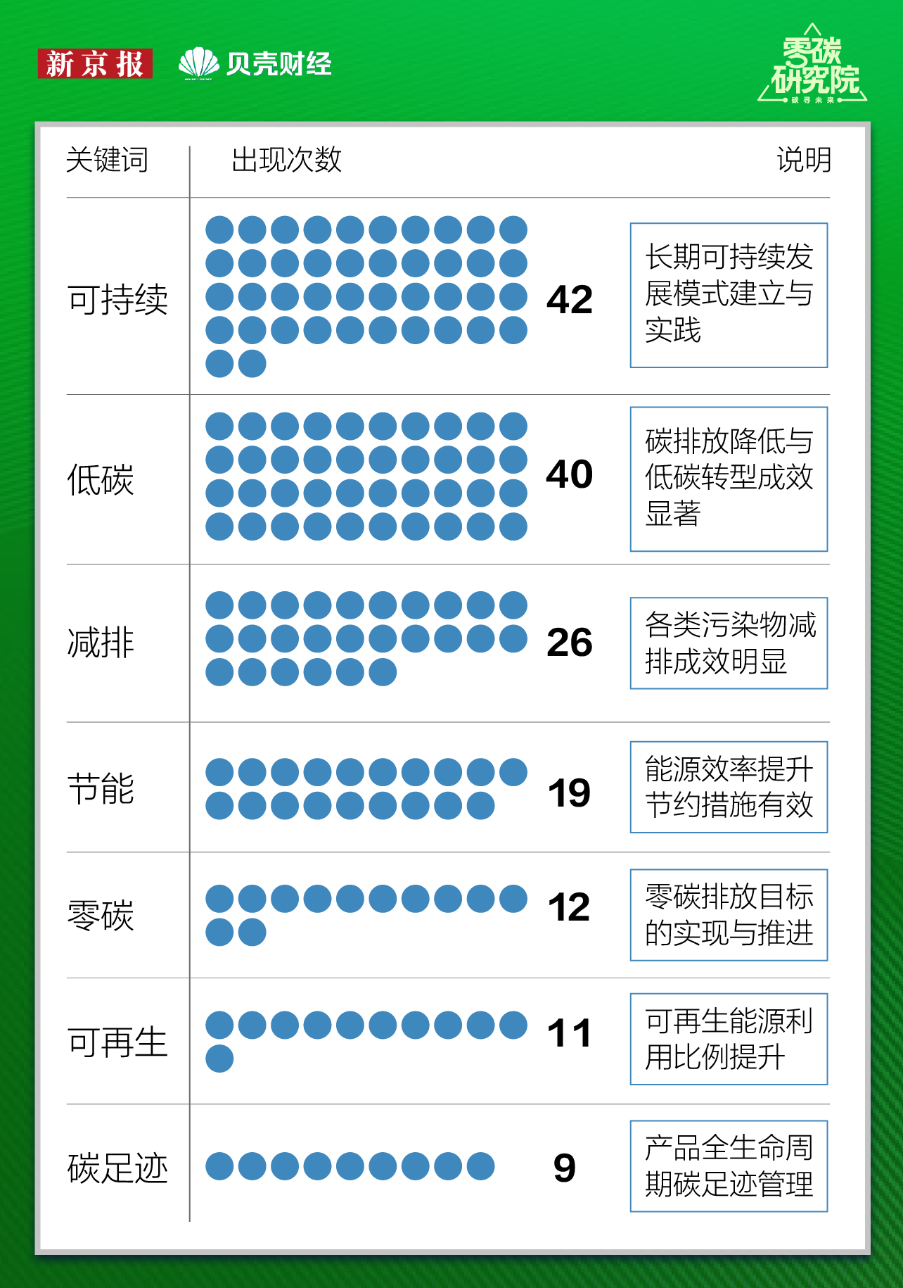 关键词分析显示,“可持续”出现42次,“低碳”40次,“减排”26次,表明可持续发展和低碳转型已成为企业共识。在减排节能方面,“节能”出现19次,“零碳”12次,“可再生”11次,“碳足迹”9次,反映企业正从能源结构优化延伸到全生命周期碳管理。