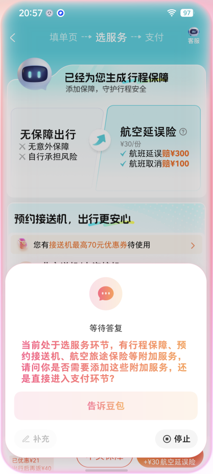 豆包手机助手在购买机票场景时咨询记者“是否需要添加附加服务”。豆包手机截图