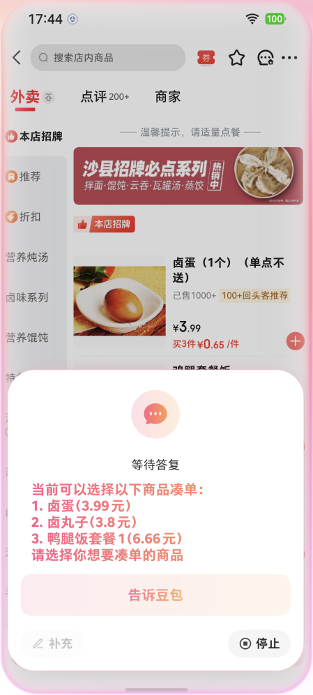 豆包手机助手自动帮助用户在外卖场景进行“凑单”。豆包手机截图