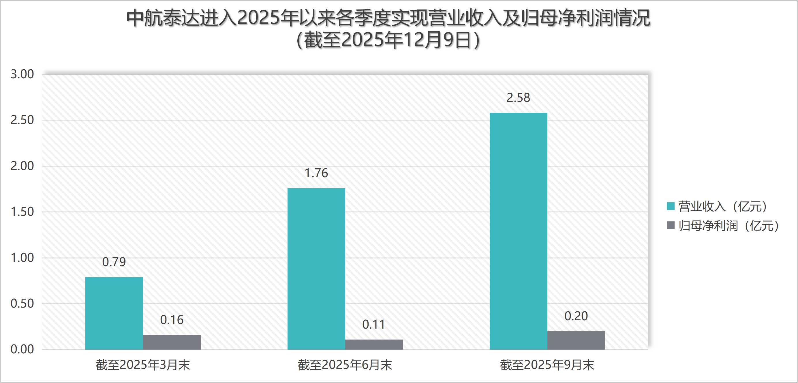 进入2025年以来,从财务数据上看,中航泰达各季度内实现营业收入持续增长,但归母净利润则呈现出“倒V”态势,截至6月末,公司实现归母净利润为0.11亿元,在三个季度中最低。
