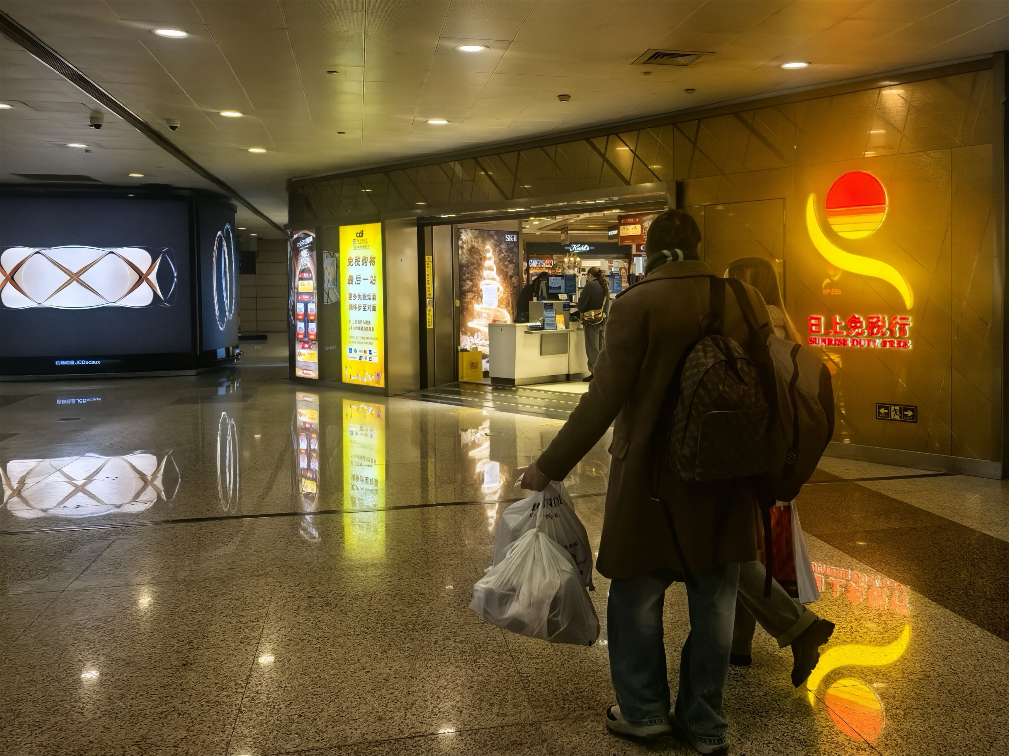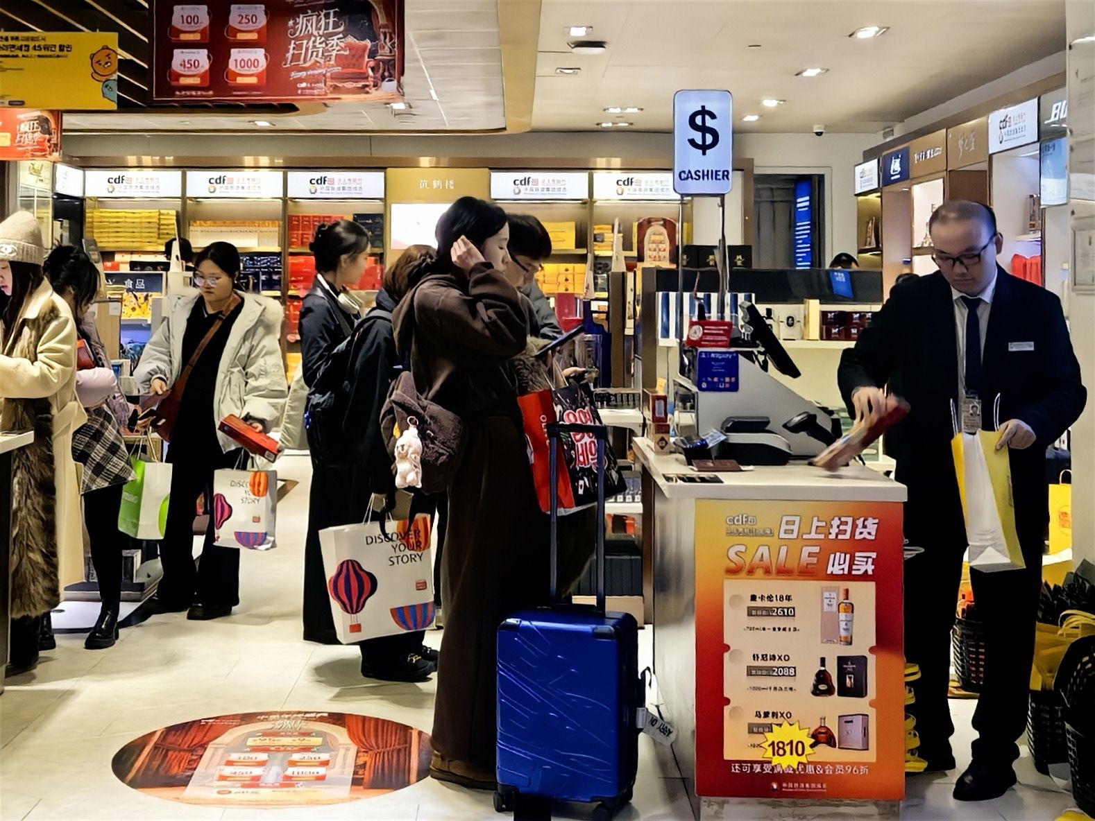12月10日18时许,日上免税店迎来了当天入境航班的客流高峰。收银台前排起长队,烟、酒、化妆品被频繁装进印有日上标志的黄色购物袋。刚从布宜诺斯艾利斯回国的张立昂(化名)抱着刚买的两条香烟走出来:“浦东机场入境到‘日上’买烟酒划算,我每次下飞机都会直奔而来,已经是习惯了。”