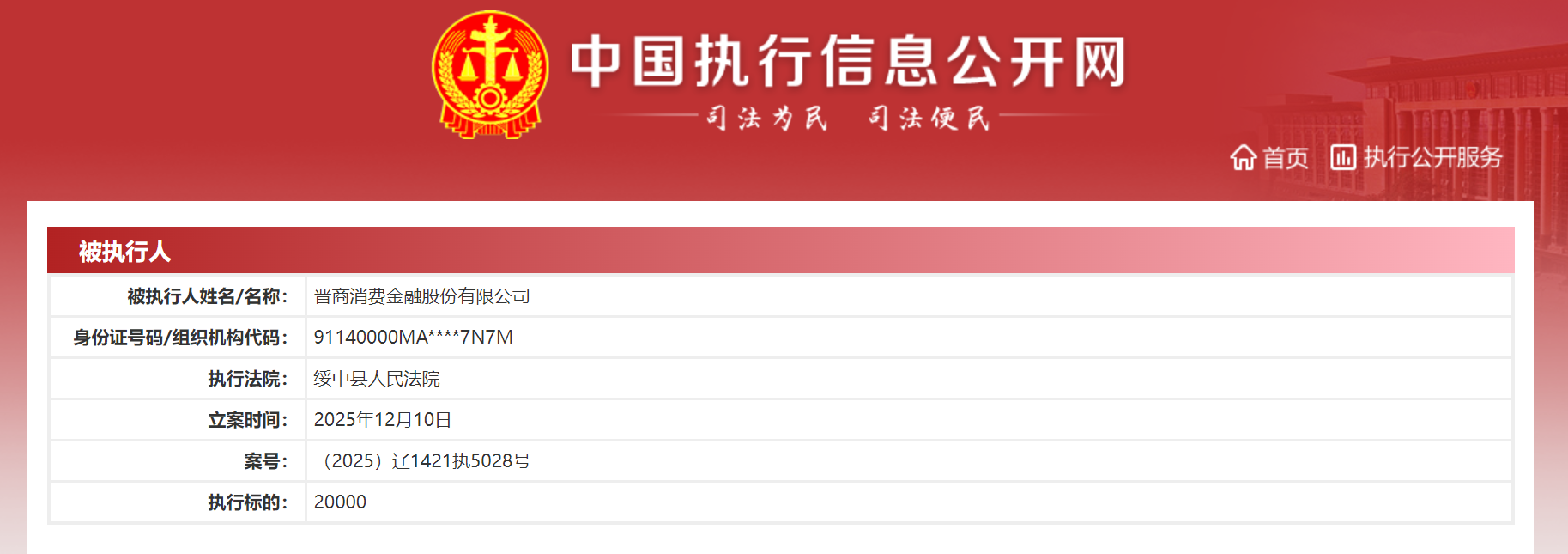 新京报贝壳财经讯(记者黄鑫宇)12月15日,中国执行信息公开网及企查查共同显示,晋商消费金融股份有限公司(即晋商消费金融)成为被执行人,执行法院为辽宁省葫芦岛市绥中县人民法院,立案时间为2025年12月10日,执行标的为20000元。