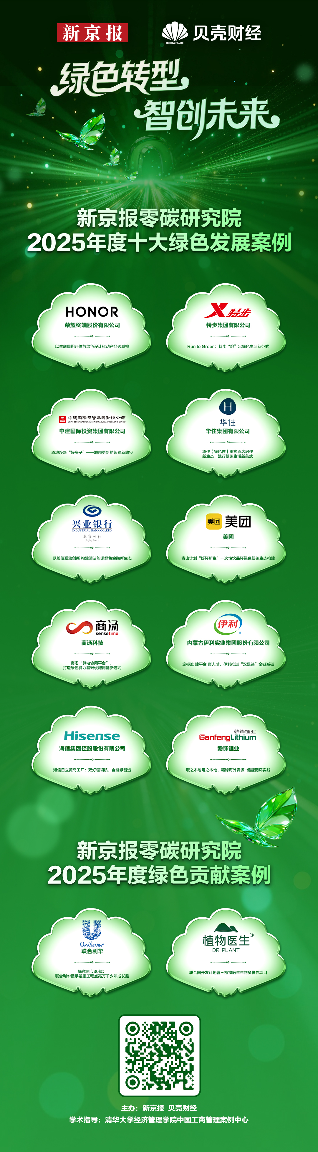 这是新京报零碳研究院第四年联合清华大学经管学院中国工商管理案例中心,征集评选和发布年度十大绿色发展案例。除了“2025年度十大绿色发展案例”,两个用以表彰在可持续发展道路上做出杰出贡献的“2025年度绿色贡献案例”也一并揭晓。它们分别是“联合利华:绿意同心30载:联合利华携手希望工程点亮万千少年成长路”“植物医生:联合国开发计划署-植物医生生物多样性项目”。