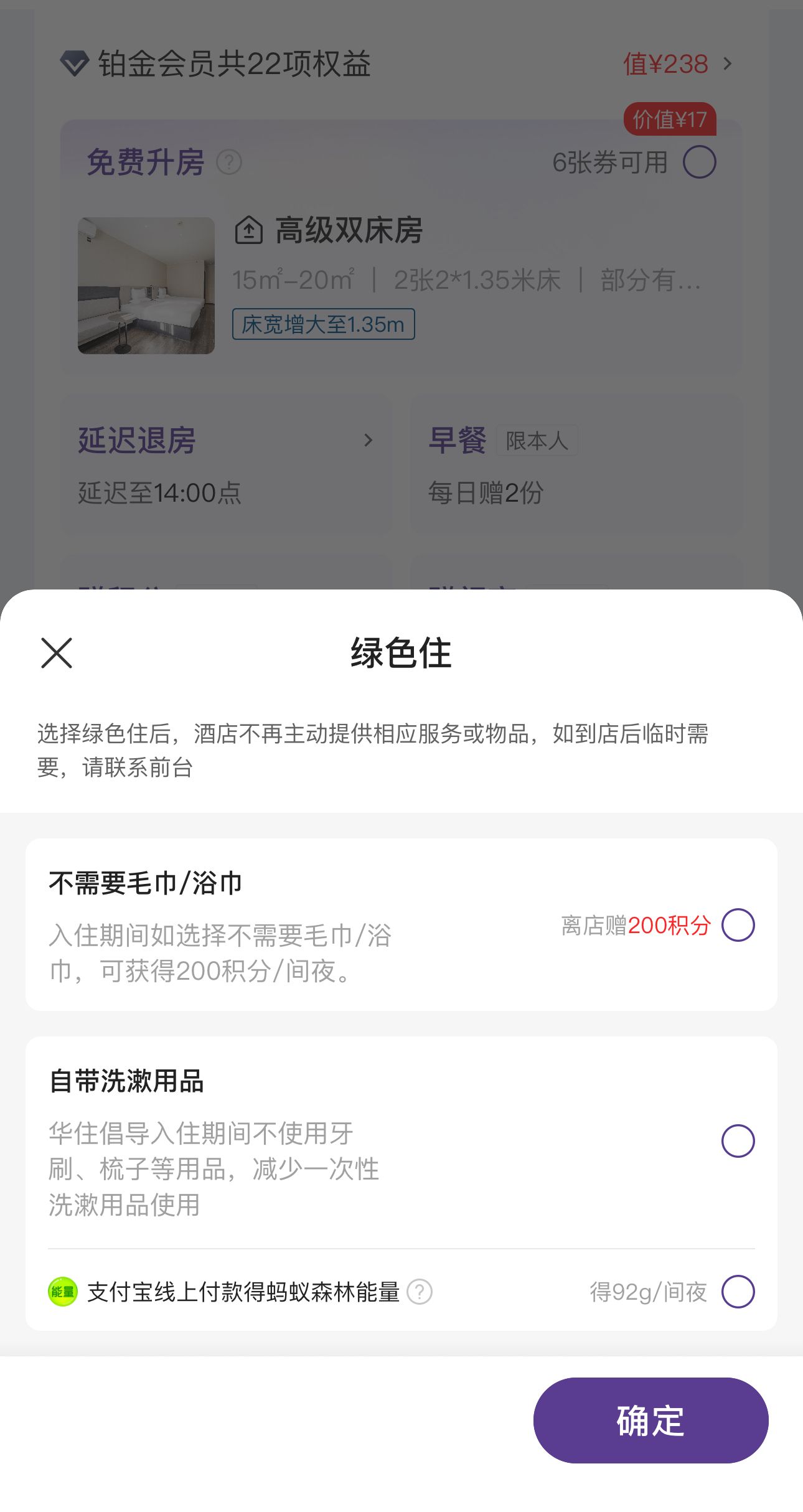 勾选后,住客可以选择在连住期间不更换布草、不打扫房间,系统会返还积分;如果自带洗漱用品,还能获得额外积分奖励。房型、价格、服务标准保持不变,入住节奏也不会被打断——对住客来说,唯一的变化是:他们清楚自己做出了一个“绿色”的决定。