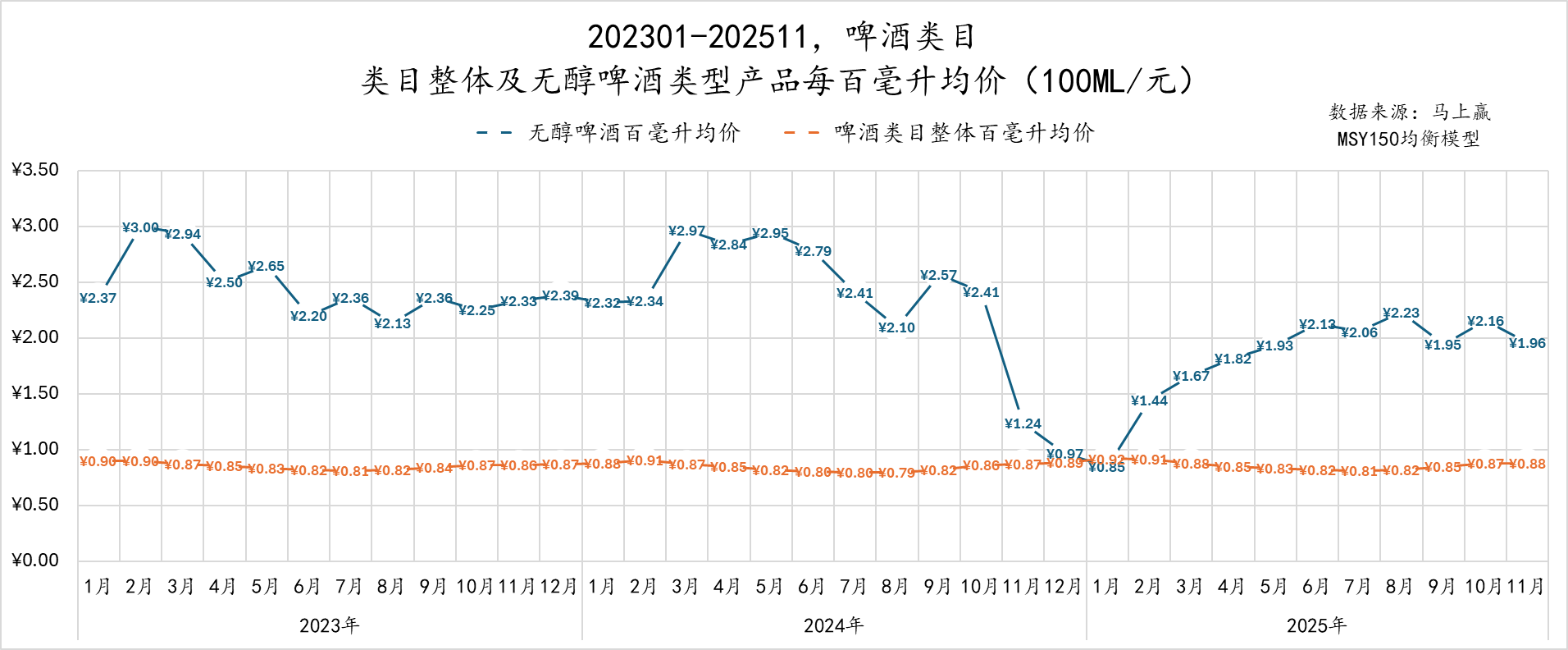 任运志表示,基于马上赢2023年1月-2025年11月的数据来看,穿透规格去看百毫升均价,无醇啤酒与啤酒类目整体基本上保持着2—3倍的百毫升均价价差,即比啤酒类目整体均价贵2—3倍。进入2025年以来,相比2023年、2024年,无醇啤酒的百毫升均价有所降低,但相比啤酒类目整体的百毫升均价依然有着两倍左右的价差。