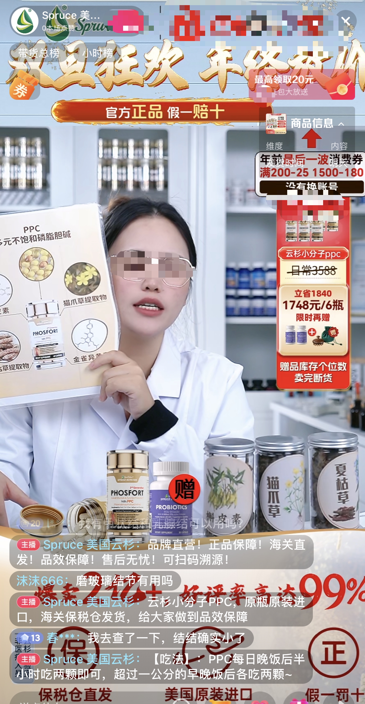 “你们可以先把自己的情和况(情况)以及问和题(问题)跟我讲一下,如果是第一次来我们直播间的,您看下有没有下面这几位家人问的情和况(情况)问和题(问题)产生,如果大家有,可以把自己具体的情和况(情况)分享在直播间。”在SPRUTRITION美国云杉直播间中,一位身穿白大褂的主播手举产品主要成分牌,进行产品推荐。