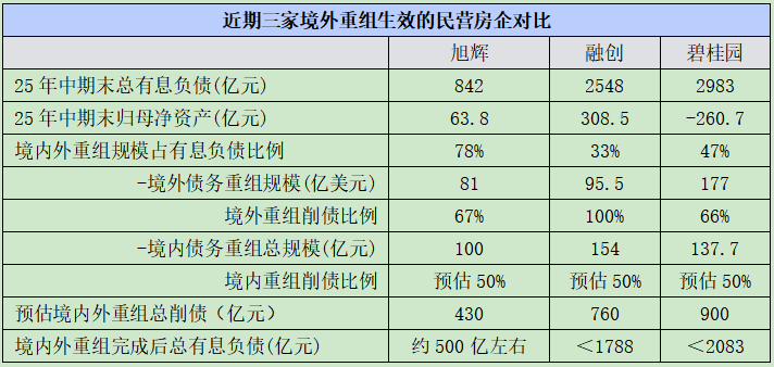 同时,旭辉控股境内债重组涉及7笔公开市场债券,金额100.6亿元。重组方案通过现金回收、债转股、以资抵债等方式,预计可削减债务超50亿元,且未来两年无需支付本息,为业务恢复与经营改善提供了关键窗口期。