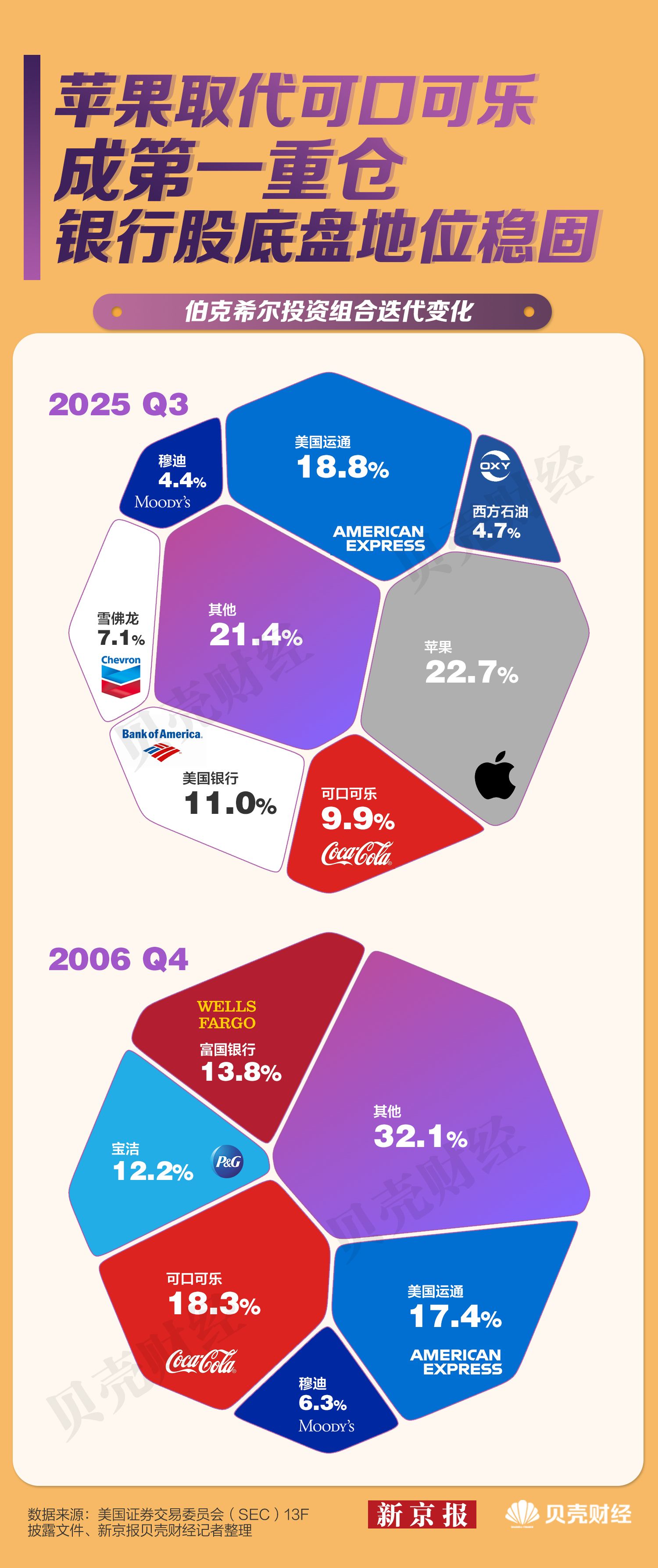 2025年11月,伯克希尔发布了2025年第三季度持仓报告,这是巴菲特任期内最后一次披露的季度持仓。苹果以22.69%的占比连续第32个季度位居第一。同时,伯克希尔首次建仓1784万股谷歌母公司Alphabet股票,使其以1.62%的占比跻身前十大持仓。