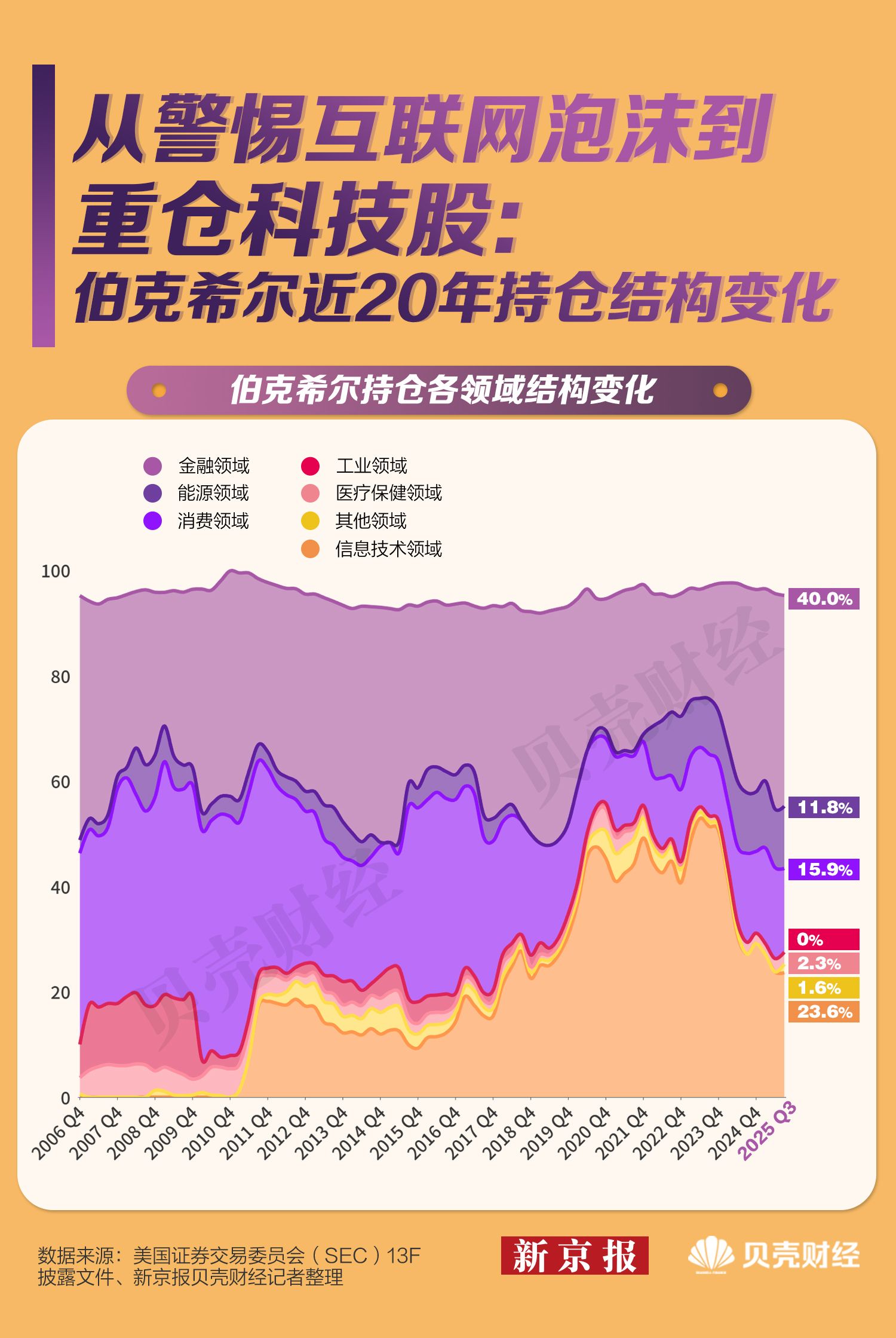 新京报贝壳财经记者梳理了伯克希尔近二十年的投资持仓变化和巴菲特自1977年以来写给股东的49封致股东信,回溯这位“股神”的价值投资者,从“回避科技”到“重仓科技”再到“减持科技”的态度转向,解码在逆势与顺势之间,他是如何做出取舍,又有哪些的思考和判断。