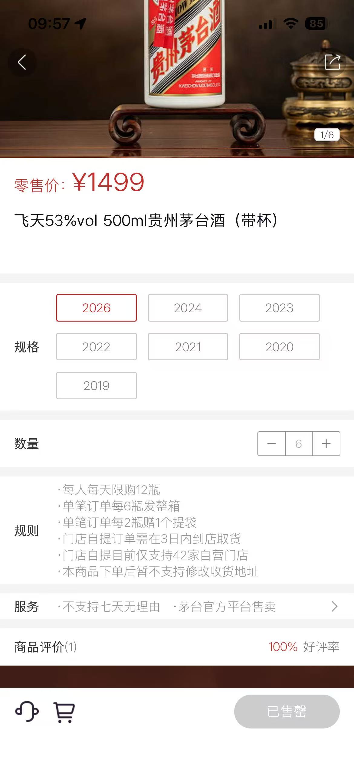 500毫升53度飞天茅台上线i茅台备受关注。记者注意到,1月1日9时该产品开售,便出现购买火爆的现象,为了让更多消费者有机会购买产品,茅台采取分时段投放,即5分钟间隔补一次货,每人每天限购12瓶,不同年份售价不同,如2026年售价1499元/瓶。