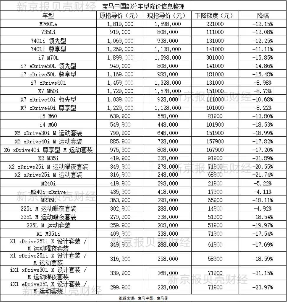 据新京报贝壳财经记者了解,此次宝马降价的车型包含了2系、7系、X1、X2、X6、i7、iX1等,而3系、5系、X3等热门车型未参与降价。