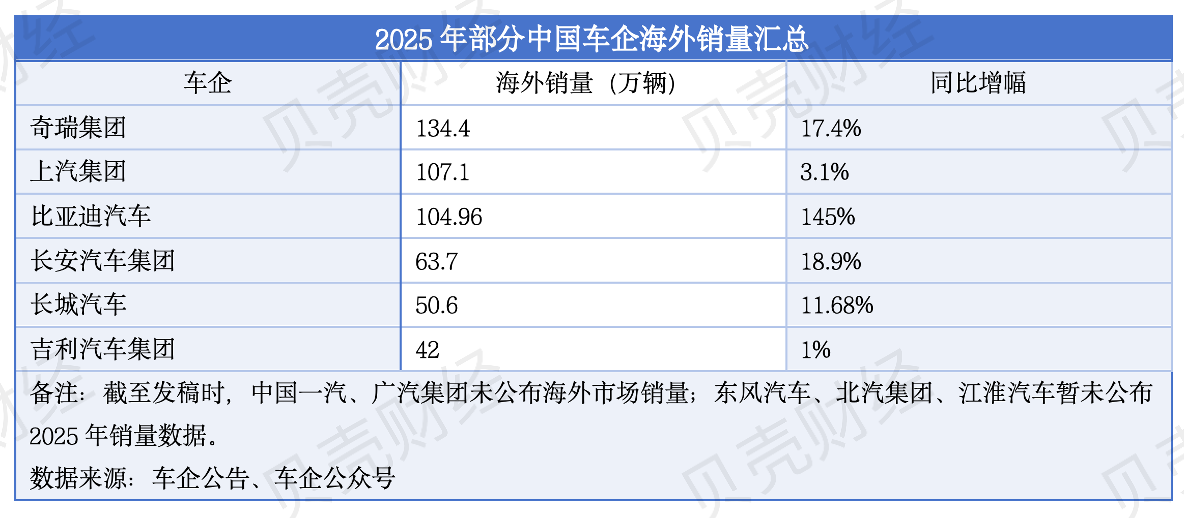 2025年部分中国车企海外销量汇总。新京报贝壳财经记者 张冰 制图