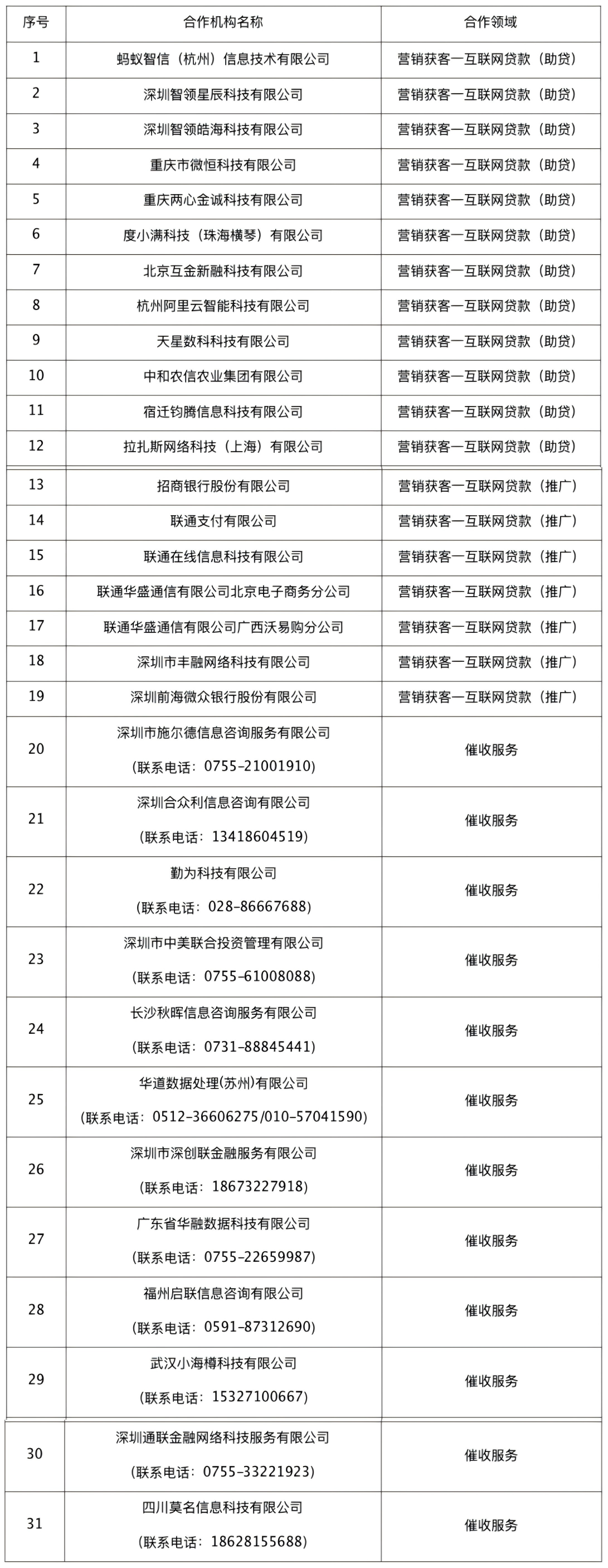 招联消金2025年11月28日公示的信贷业务第三方合作机构信息披露,目前与招联消金合作的第三方机构共分为12家营销获客助贷机构、7家营销获客推广机构以及12家催收服务机构。