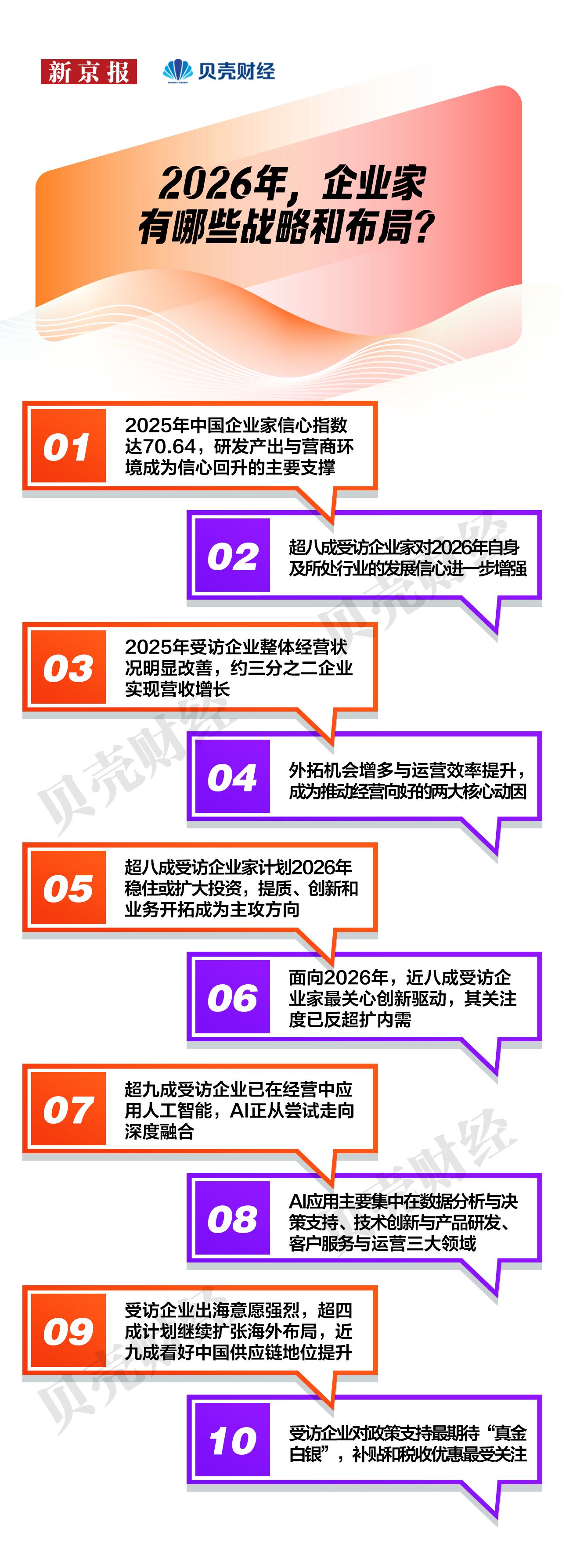 作为经济增长的“压舱石”与创新突破的“发动机”,企业的信心与战略选择,始终是观察中国经济趋势的风向标。2026年伊始,新京报贝壳财经再次面向19个行业的154位企业家展开问卷调研,系统梳理企业家对过去一年经营状况与发展环境的判断,以及对新一年趋势的展望。