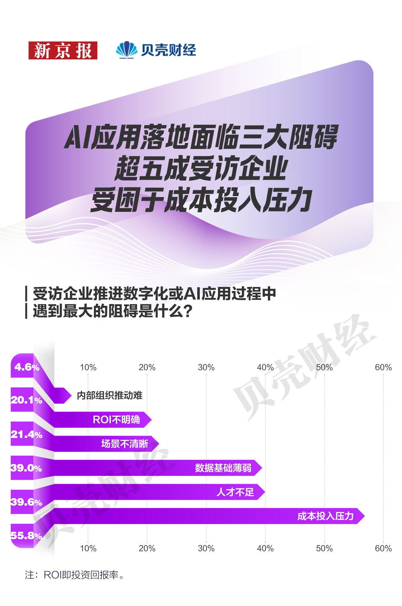 此外,约两成企业面临场景不清晰、ROI(投资回报率)不明确的问题。在探索阶段,企业尚难明确AI如何与具体业务结合、能否带来可量化的经济回报。