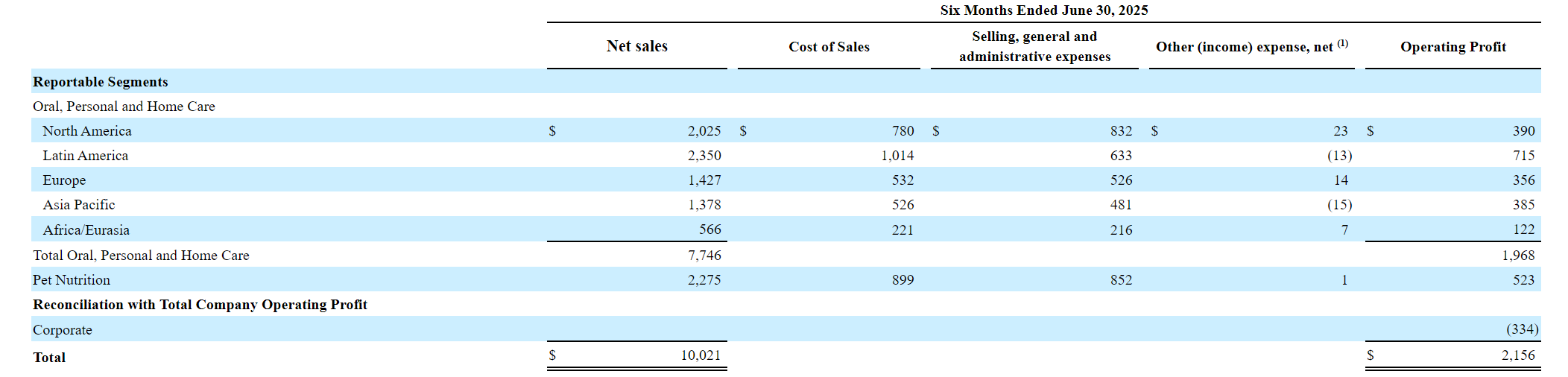 到了2025年上半年,高露洁实现净销售额100.21亿美元,同比减少了1.02%;营业利润约21.56亿美元。其中,口腔、个人和家庭护理业务录得净销售额77.46亿美元,与上年同期的79.08亿美元相比下滑2.05%。这一核心业务,在包含中国的亚太市场净销售额同比下滑2.13%至13.78亿美元。