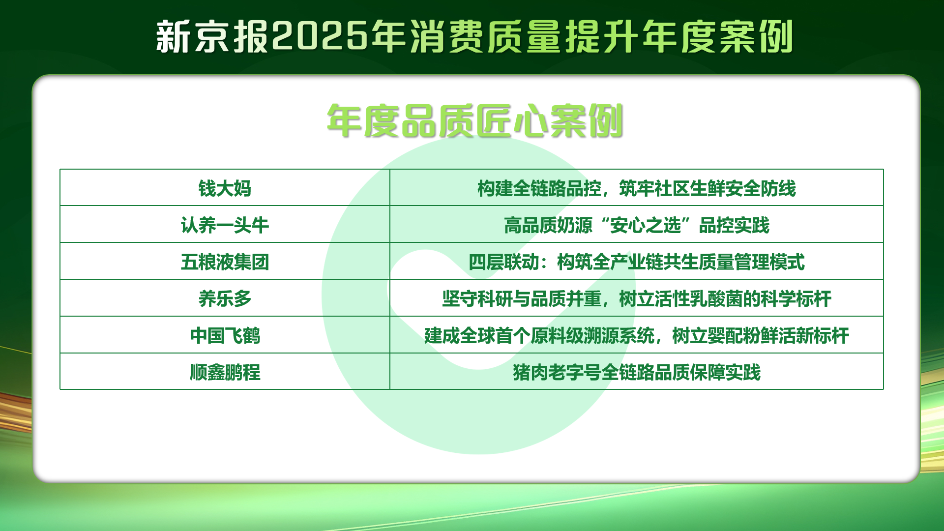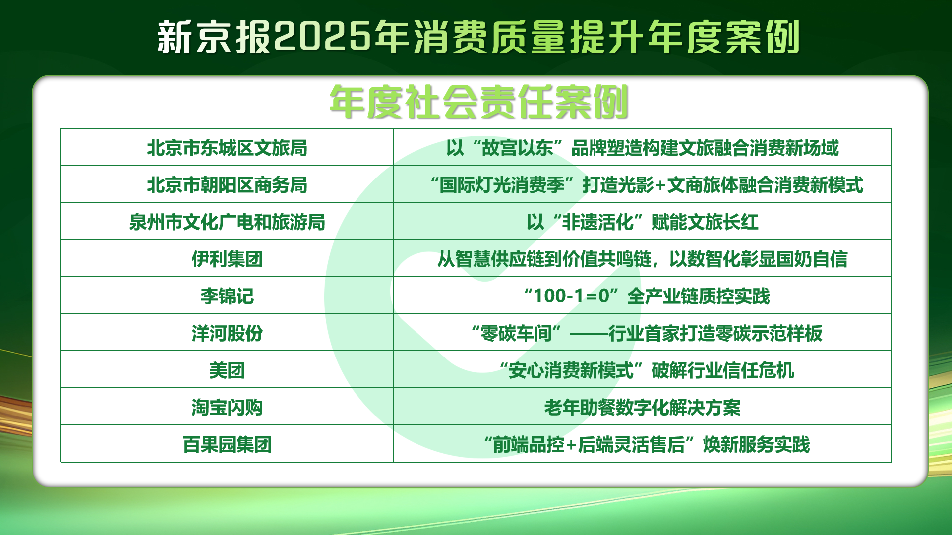历时一个多月的征集与评选,有29家政府部门、企业团体最终入选“消费质量提升年度案例”。其中,北京市东城区文旅局、北京市朝阳区商务局、泉州市文化广电和旅游局、伊利集团等9家企业入选“年度社会责任案例”;钱大妈、认养一头牛、五粮液集团、养乐多、中国飞鹤、顺鑫鹏程等6家企业入选“年度品质匠心案例”;君乐宝乳业集团、美赞臣、苏州稻香村集团、燕京啤酒、茶百道等14家企业入选“年度创新实践案例”。