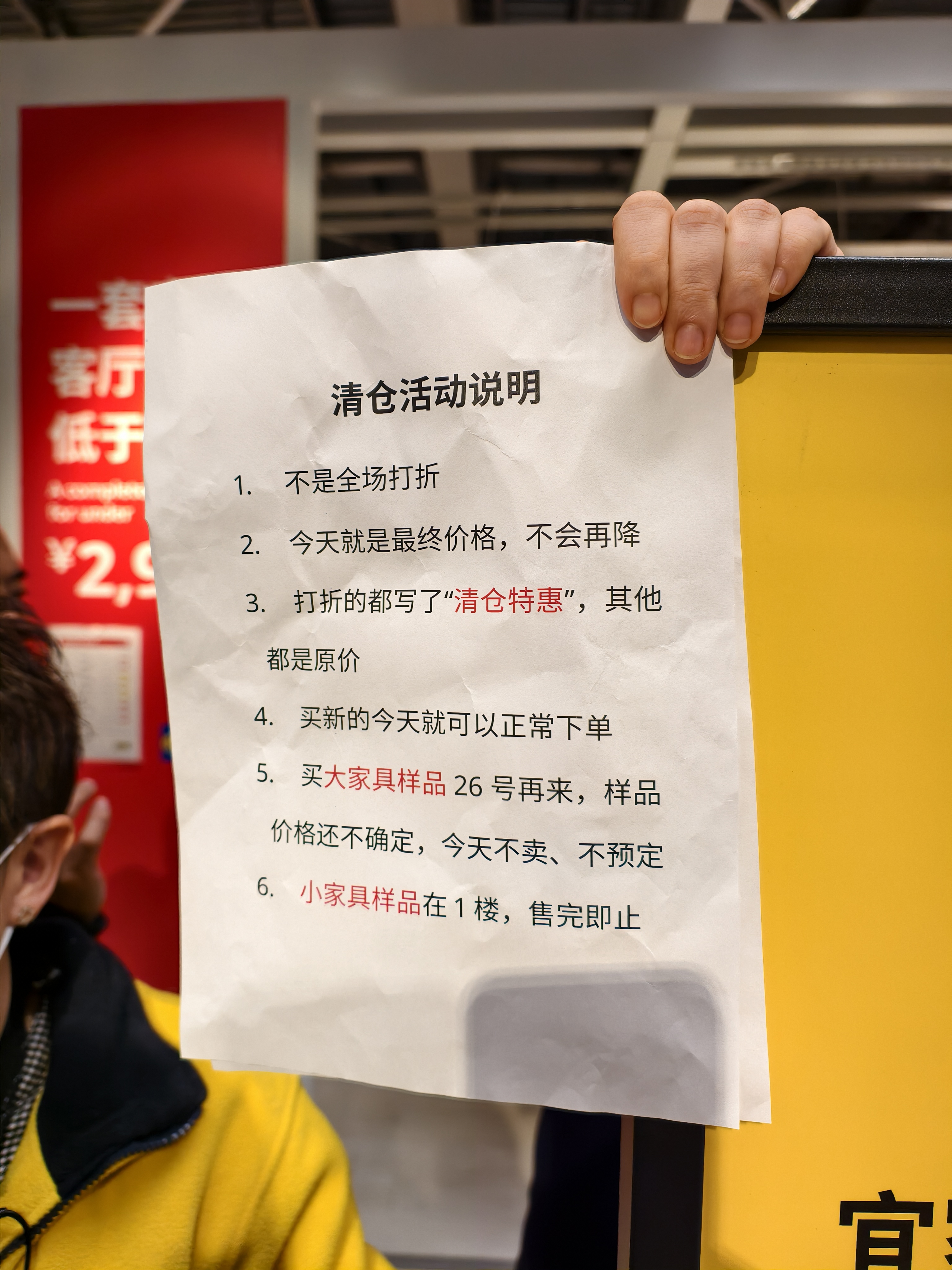 店内特意补充说明称,本次优惠促销不是全场打折,当天最终价格不会再降,大家具样品的价格则暂未确定,顾客需要等1月26日再来。