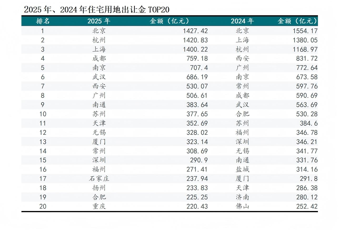 此外,西安从第4位跌至第7位,土地出让金降幅超30%。常州从第7位骤降至第14位,出让金近乎腰斩。合肥从第10位滑落至第19位,出让金降幅也超50%。而在2024年上榜的盐城、济南、佛山,在2025年则退出前20名。这些城市或受供地节奏,或遭遇了房企策略调整的冲击。