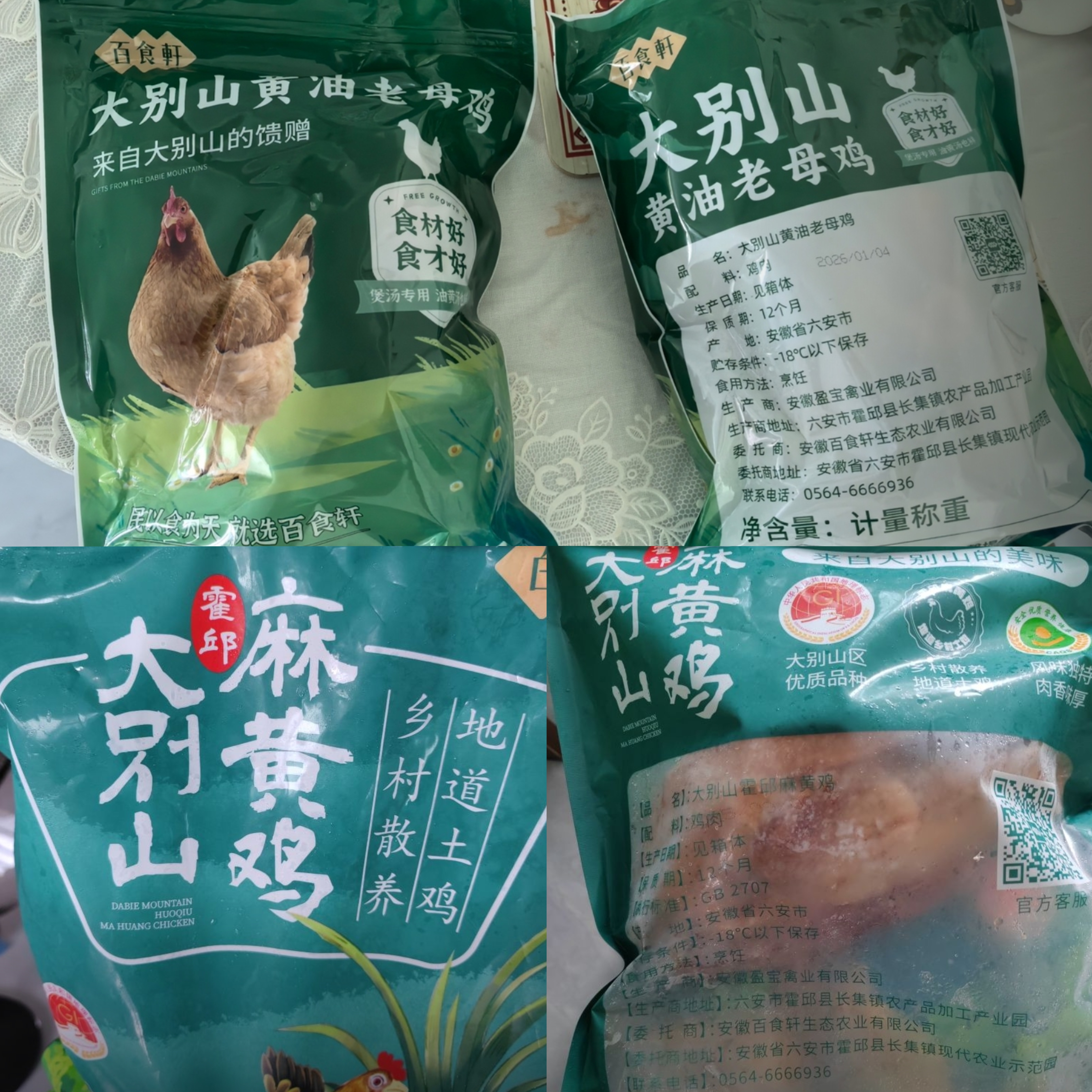 通过评论区消费者反馈的实物图可以看到,两款产品包装并不相同。其中,“大别山麻黄鸡”产品包装的正背面印有“中华人民共和国地理标志”专用标志,包装大字为“大别山麻黄鸡”+“霍邱”红色印章,背面食品标签的品名为“大别山霍邱麻黄鸡”。而“大别山黄油老母鸡”产品包装上没有“中华人民共和国地理标志”专用标志,包装大字和背面食品标签的品名均为“大别山黄油老母鸡”。