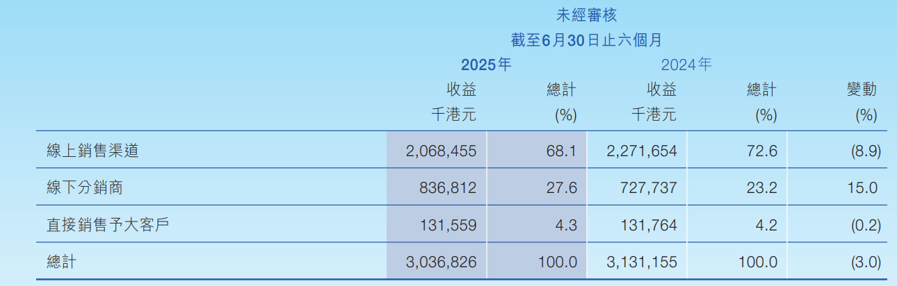 尴尬的是,当蓝月亮开始控制销售及分销开支,不再执着于“流量”,其布局的新兴渠道未能保持稳定增长。与此同时,2025年上半年,蓝月亮线上销售渠道的收益同比下滑8.9%至20.68亿港元,主要原因是“优化资源分配至不同的销售渠道”。