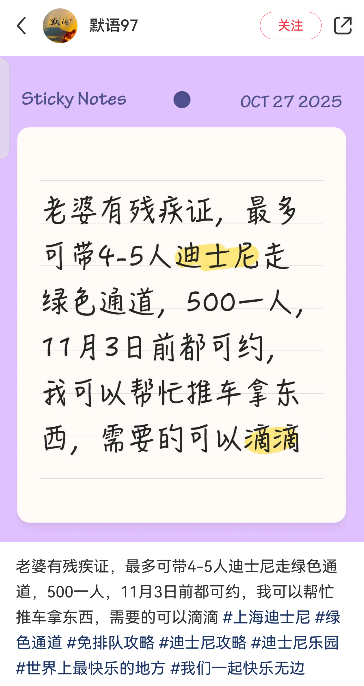 “上海迪士尼残疾证登记卡快速通道,1月25日、2月周末还有位置。”