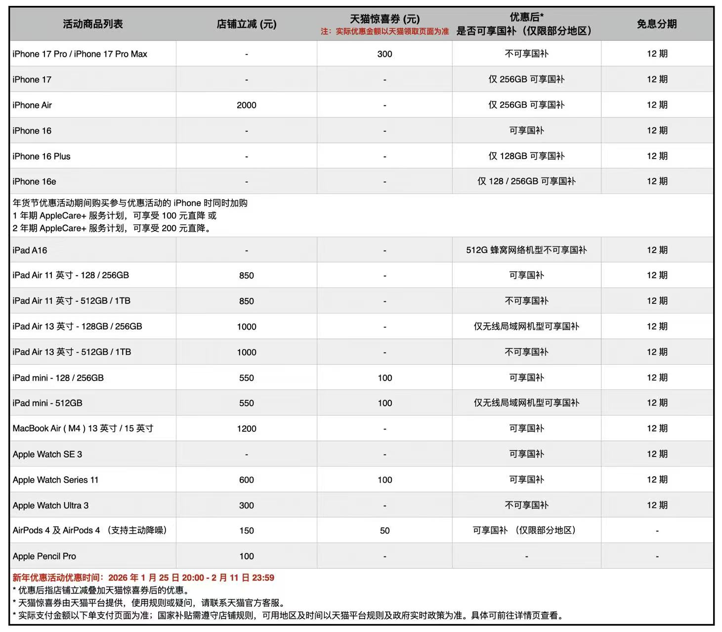 天猫年货狂欢节将于25日20:00开始,持续到2月11日23:59:59,狂欢节期间,iPhone Air的库存共13000台。