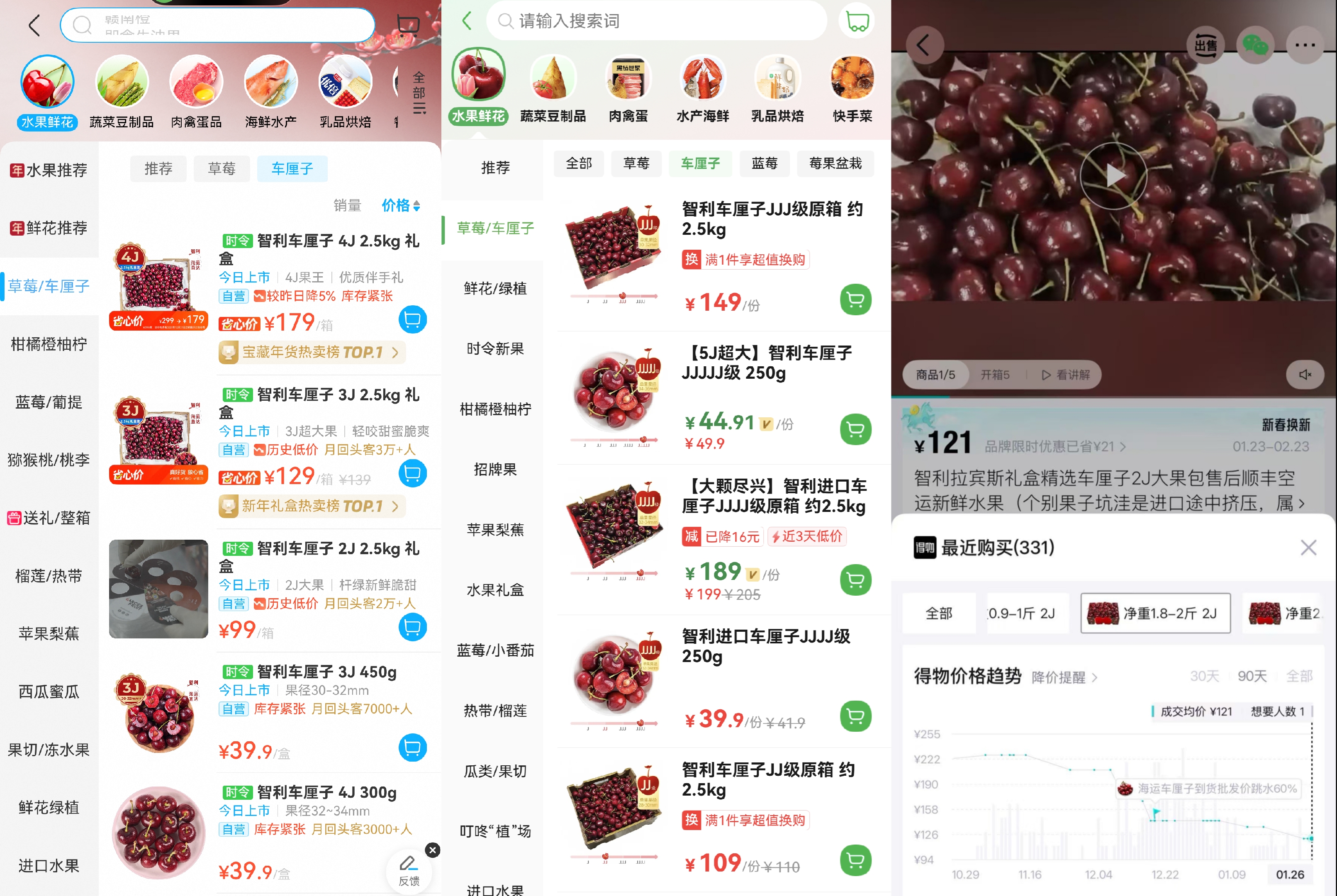 1月26日,各大电商平台车厘子价格。电商APP截图