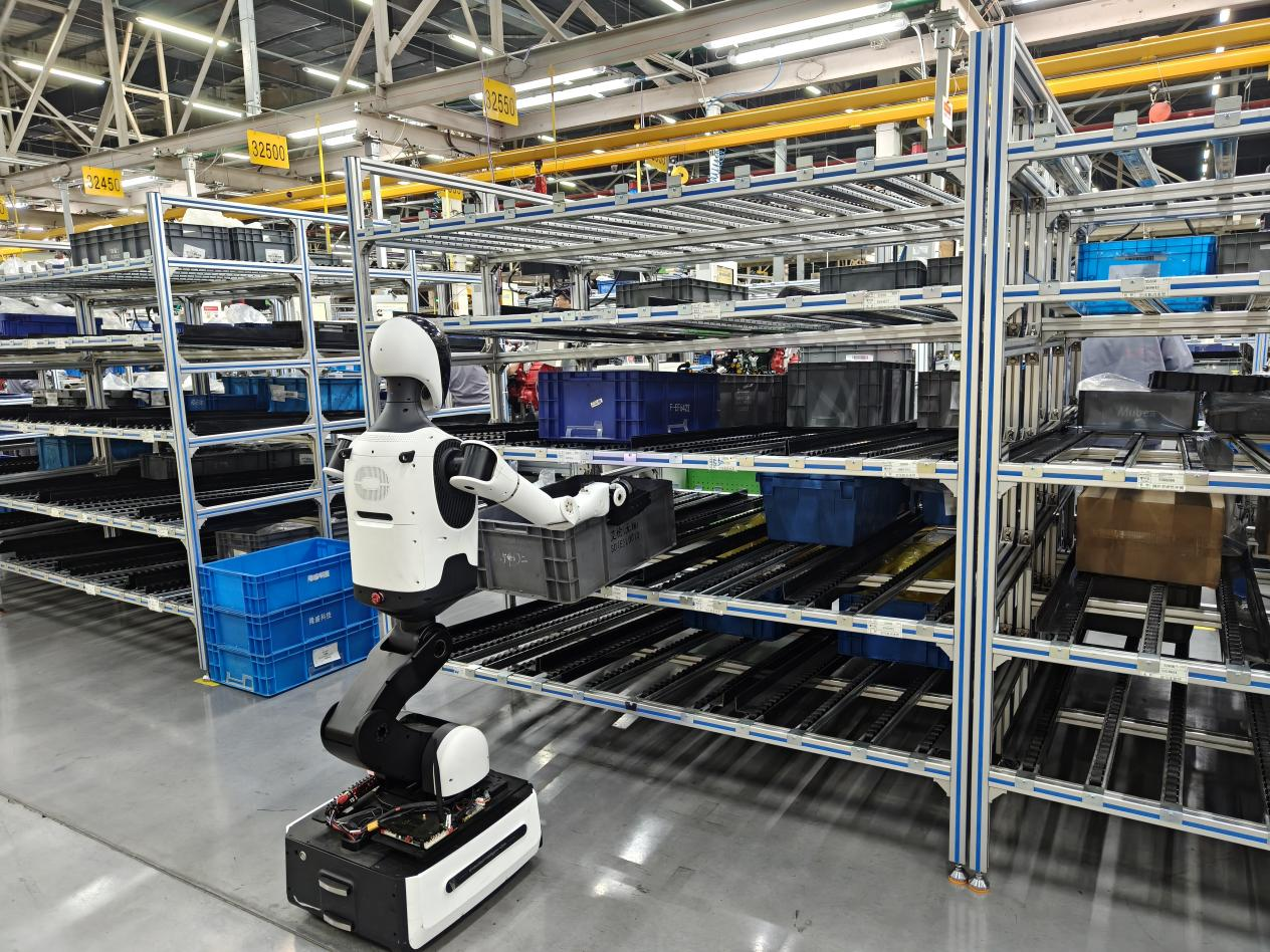 在北京昌平的福田康明斯工厂内,天轶机器人平稳滑行至一排周转箱前,机械臂上配备的夹具精准扣住箱体两侧,整个过程不到四分钟,六个箱子便被放置到货架上。这台来自北京人形机器人创新中心(下称“北京人形”)的机器人,如今已在产线上高效作业,执行着物料搬运、物料分拣任务。