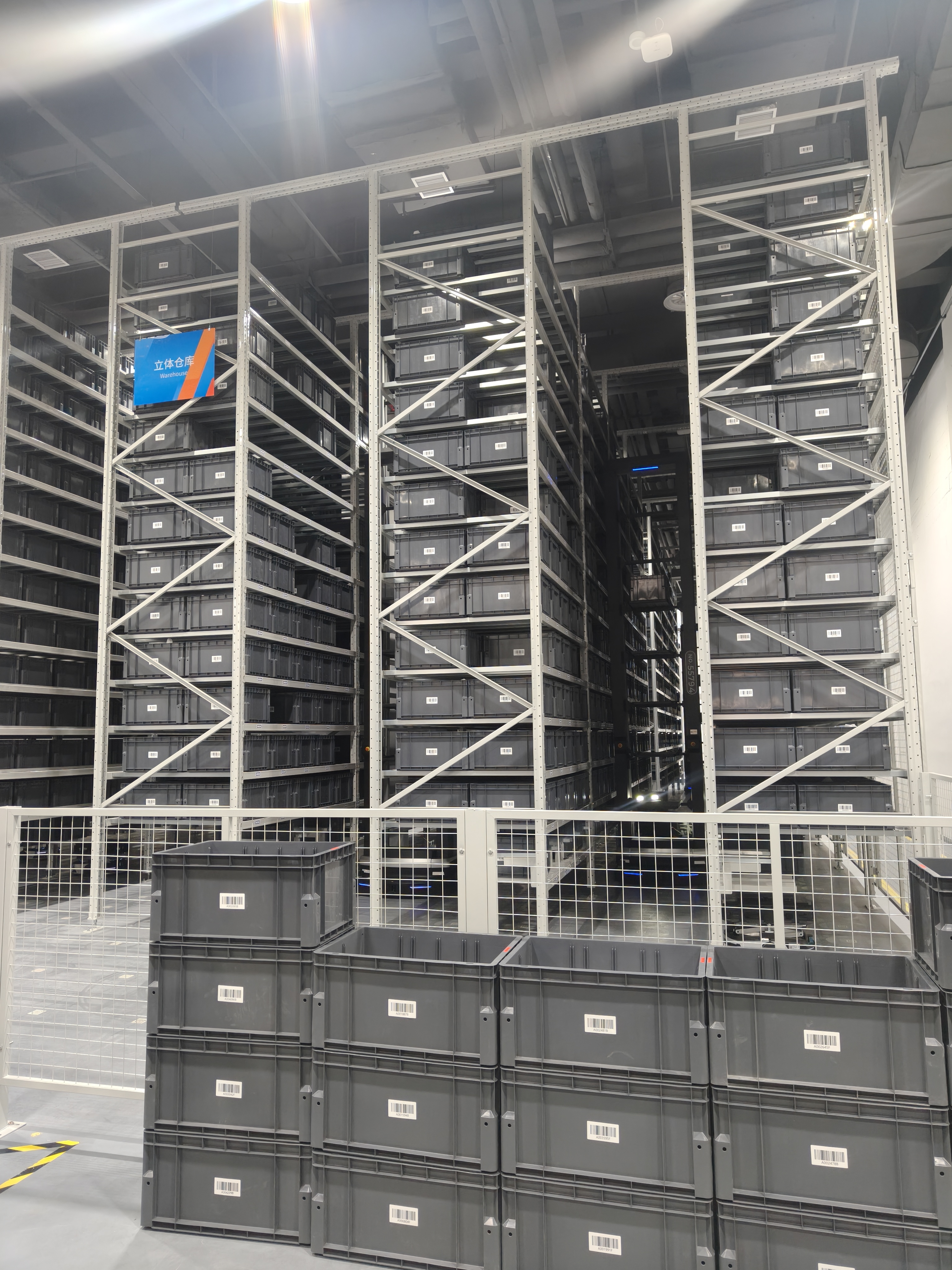 一层的智慧库房是整个平台的物流中枢。6米高的货架在300平方米空间内容纳了5000多个料箱,存储能力是传统平仓的四倍以上。入库工作站通过视觉识别与条形码系统赋予每个零部件唯一编码,出库系统则根据订单自动匹配最优拣选路径。