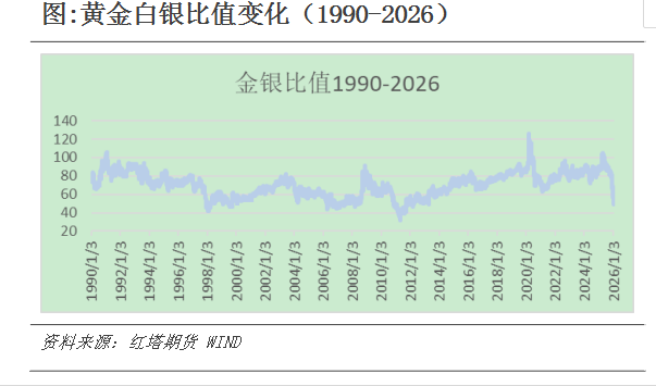 红塔期货研报显示,截至2026年1月28日,COMEX黄金价格收报5447.8美元/盎司,白银价格收报116.65美元/盎司,金银比值为46.7。上海期货交易所黄金白银主力合约收盘价分别为1186.2元/克、29.219元/克,金银比值约为40.6,显著低于COMEX金银比值。