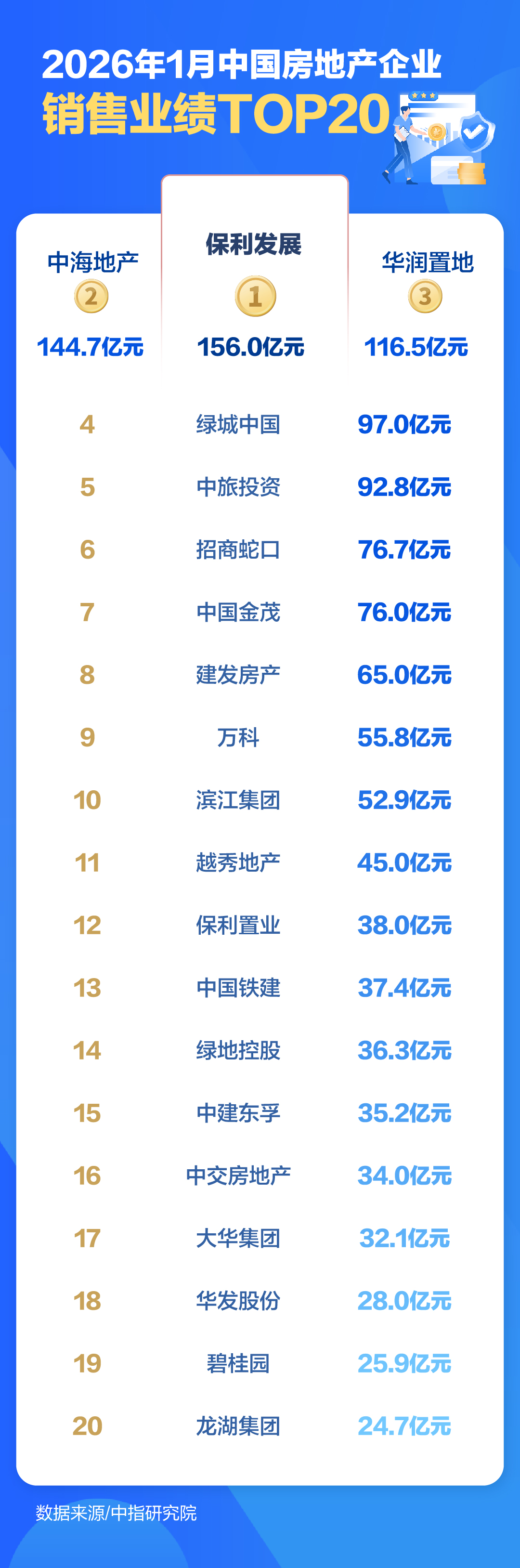 值得注意的是,相比2025年,今年1月的TOP10房企中出现了“新面孔”,那就是中旅投资,其以92.8亿元的销售额,位列百强房企第5位。