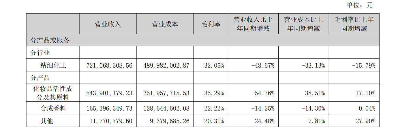 长期以来,化妆品活性成分及其原料的收入都占科思股份总营收的“大头”。2025年上半年,化妆品活性成分及其原料实现营收5.44亿元,同比减少了54.76%,在总营收中的占比约75.4%;合成香料、其他产品的营收占比分别约22.93%、1.63%。