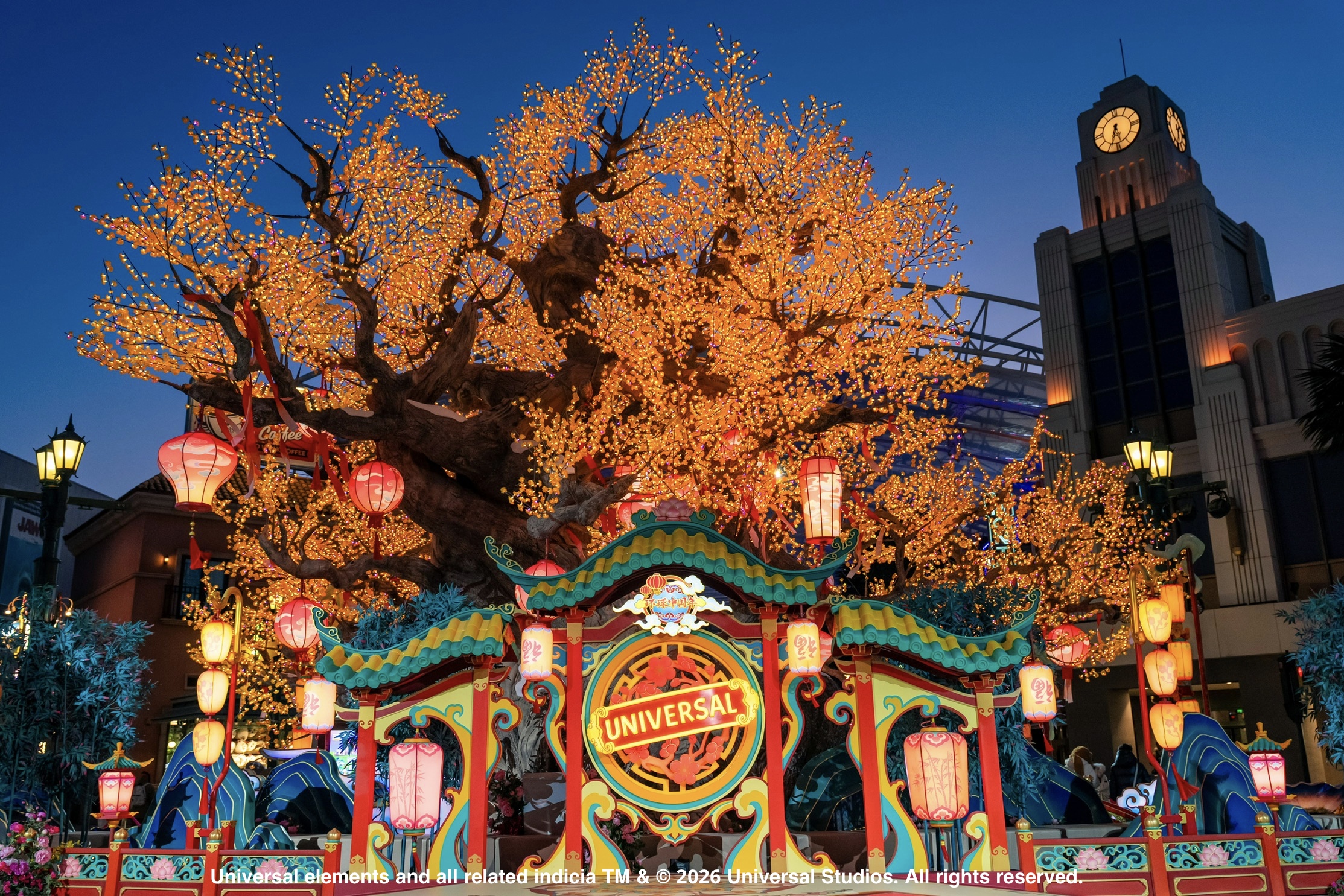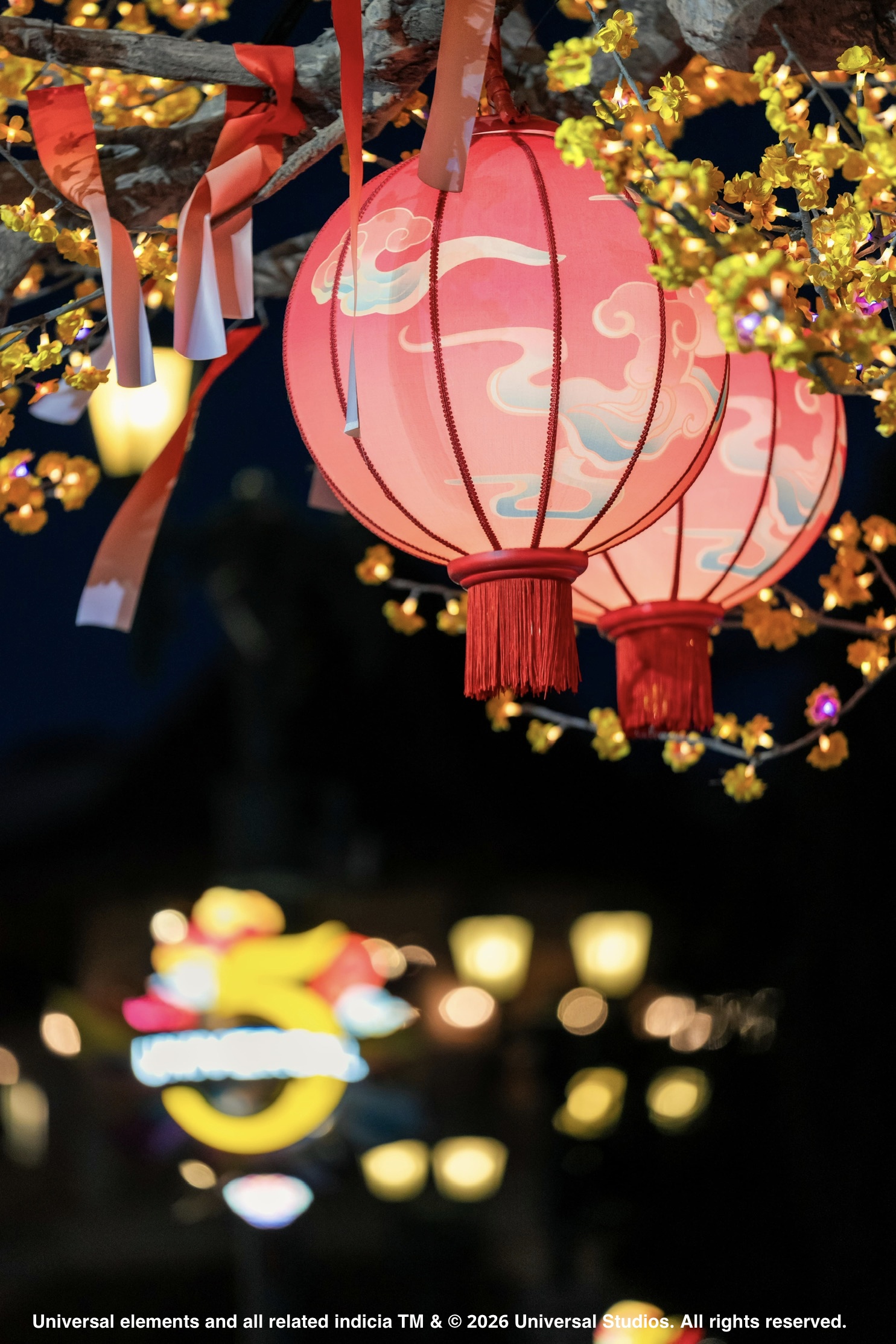 好莱坞景区、环球城市大道和新春广场被红灯笼、祥云和节庆装饰点亮,年味扑面而来。在小黄人乐园,格鲁的家被福字和鞭炮装点一新,小黄人换上马年新造型,香蕉元素也被“春节化”,人人马上“蕉”好运。