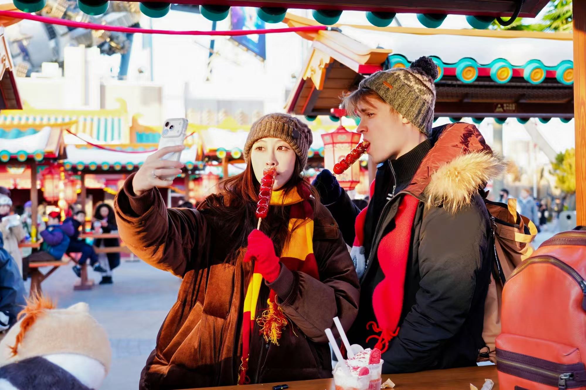 环球新春广场的热闹气息,让春节“看得见、闻得到、吃得出”。爆肚粉、肉丝煎饼、糖葫芦、绿豆糕依次排开,成为外国游客舌尖上的“中国年”。 落霞餐厅、哈蒙德餐厅推出的新春限定菜单,把中西风味自然呈现在一起。“在北京环球度假区体验中国年,能获得双重体验——童年电影记忆与春节仪式感交织在一起。”戴着新买的“糖葫芦”围巾、抱着熊猫玩偶,丹妞和妻子在金梅树下许愿后,又被新春广场上的香味吸引,“爆肚粉和糖葫芦太好吃了。”他感叹道,北方冬夜虽冷,但在环球中国年,人群、红灯、热气腾腾的小吃和欢笑交织在一起,“反而更加浪漫、更加温暖,让人流连忘返。”