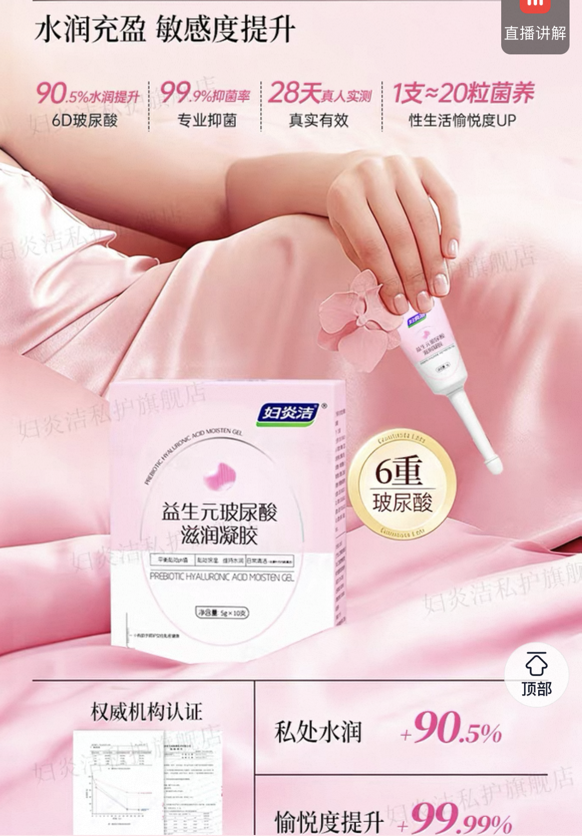 妇炎洁私护旗舰店对妇炎洁益生元玻尿酸滋润凝胶的介绍中提及“99.99%抑菌率 90.5%水润提升”等内容。