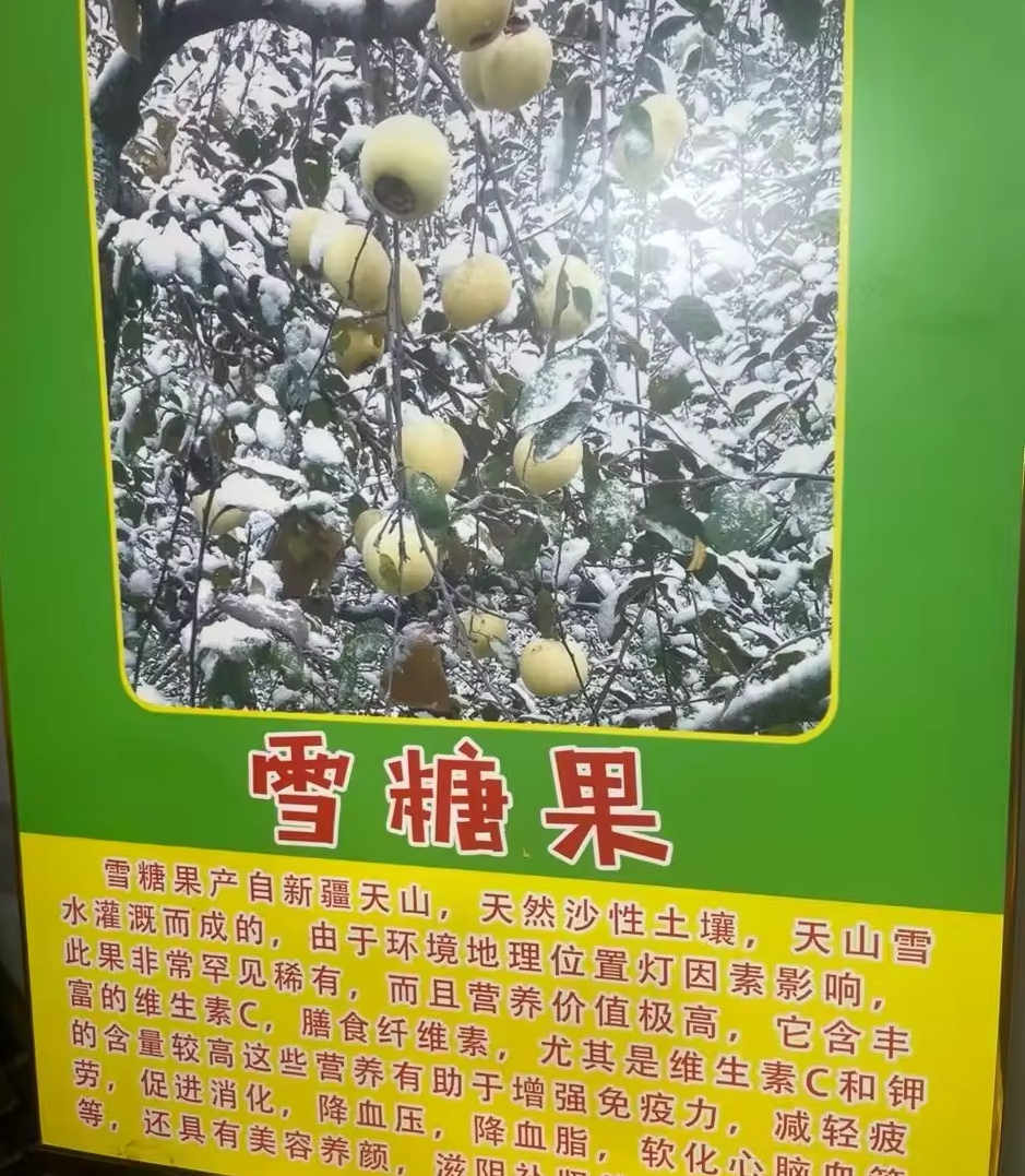 该水果并不是今年首次出现。据媒体报道,2025年5月,在杭州长宁街头也曾售卖一款声称产自新疆的“冬厘果”,外形类似苹果,果蒂处带有一圈棕色印记,与“天山雪糖果”样貌相近,宣传图同样展示其为挂于雪树之上的果实。社交媒体网友也透露,曾在2024年就在地方展销会看到该水果。根据网络图片,记者发现,所谓的“天山雪糖果”不只是黄色系的,还有青苹果色的,商家也称其为“雪糖果”。